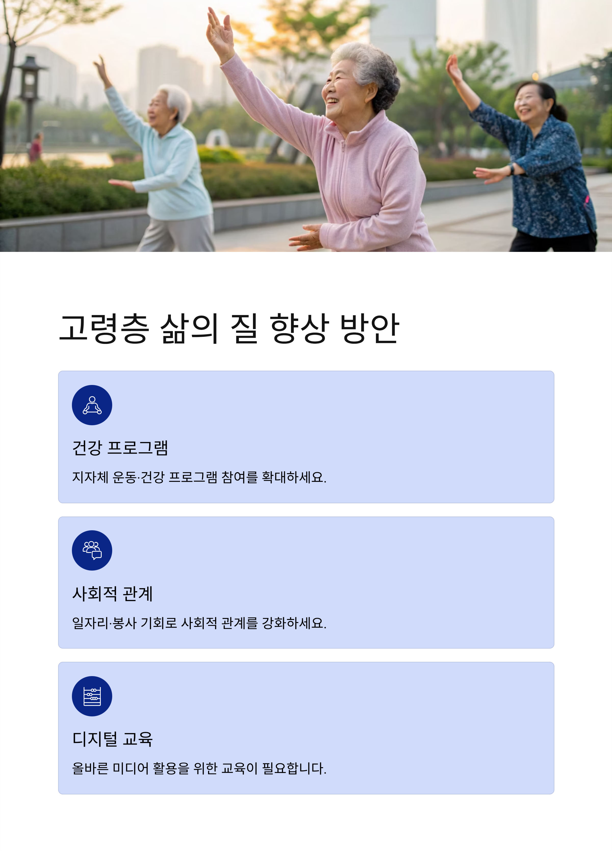 이런 노력이 병행될 때 고령층의 삶의 만족도와 건강이 함께 향상될 수 있습니다.