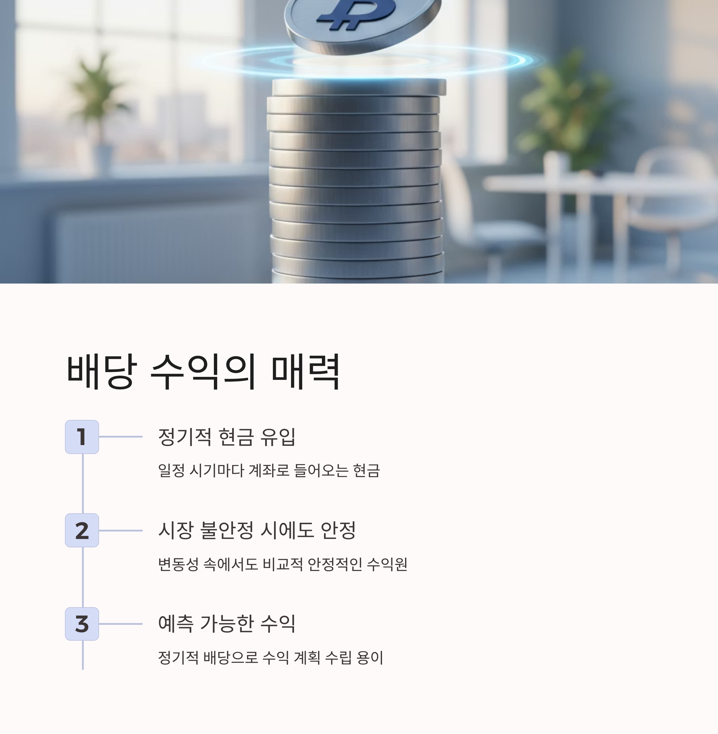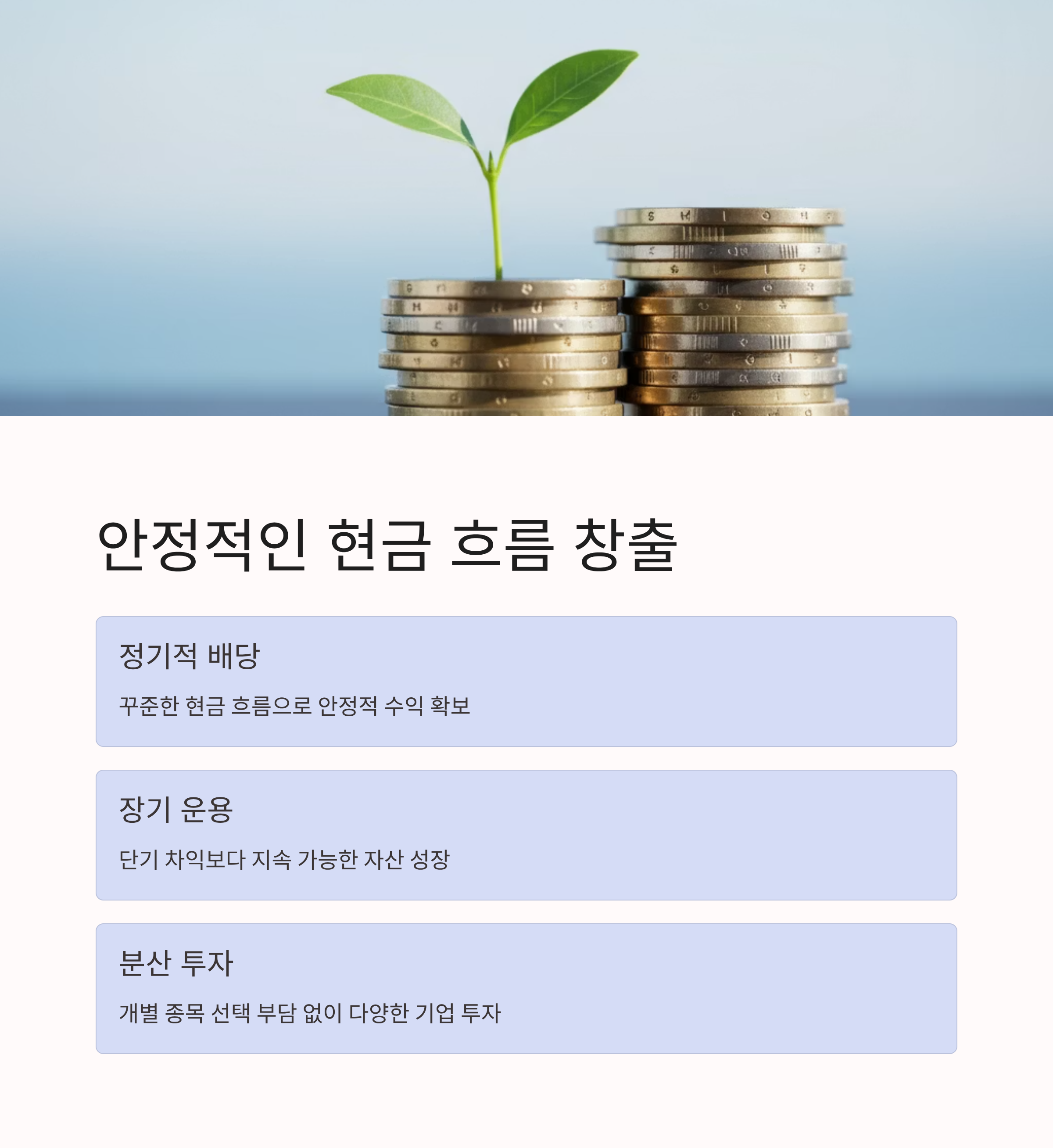 | 장점 | 정기 배당 수익, 분산 투자, 복리 효과 |