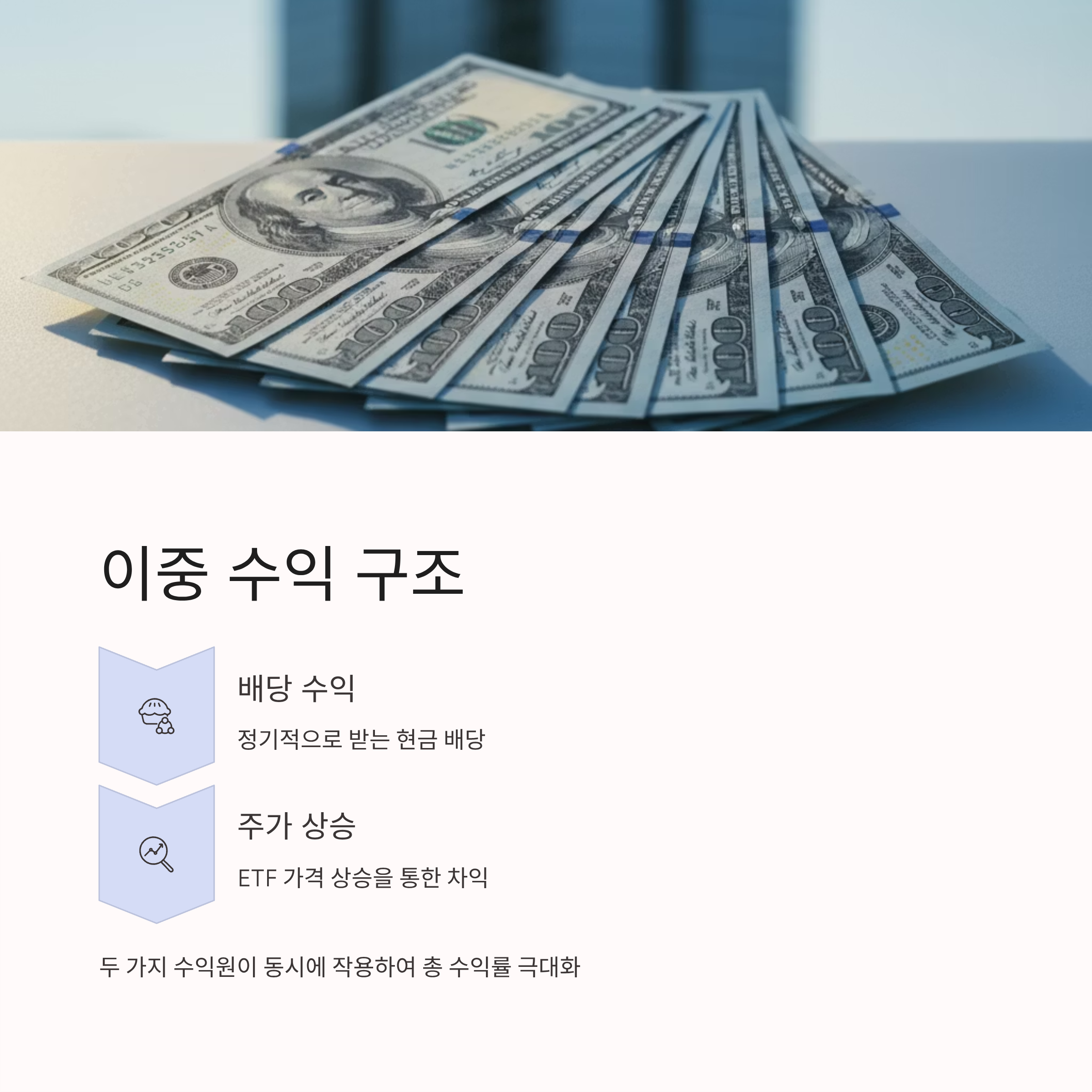 ETF는 주식시장에 상장되어 있기 때문에 가격 변동이 있습니다. 즉, 배당 수익뿐 아니라 주가 상승을 통한 차익까지 기대할 수 있어 두 가지 수익 구조가 동시에 존재합니다.