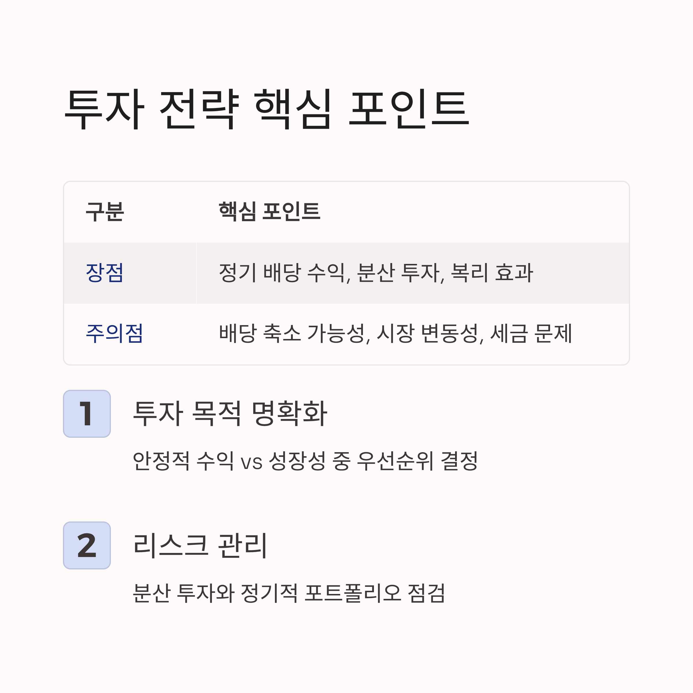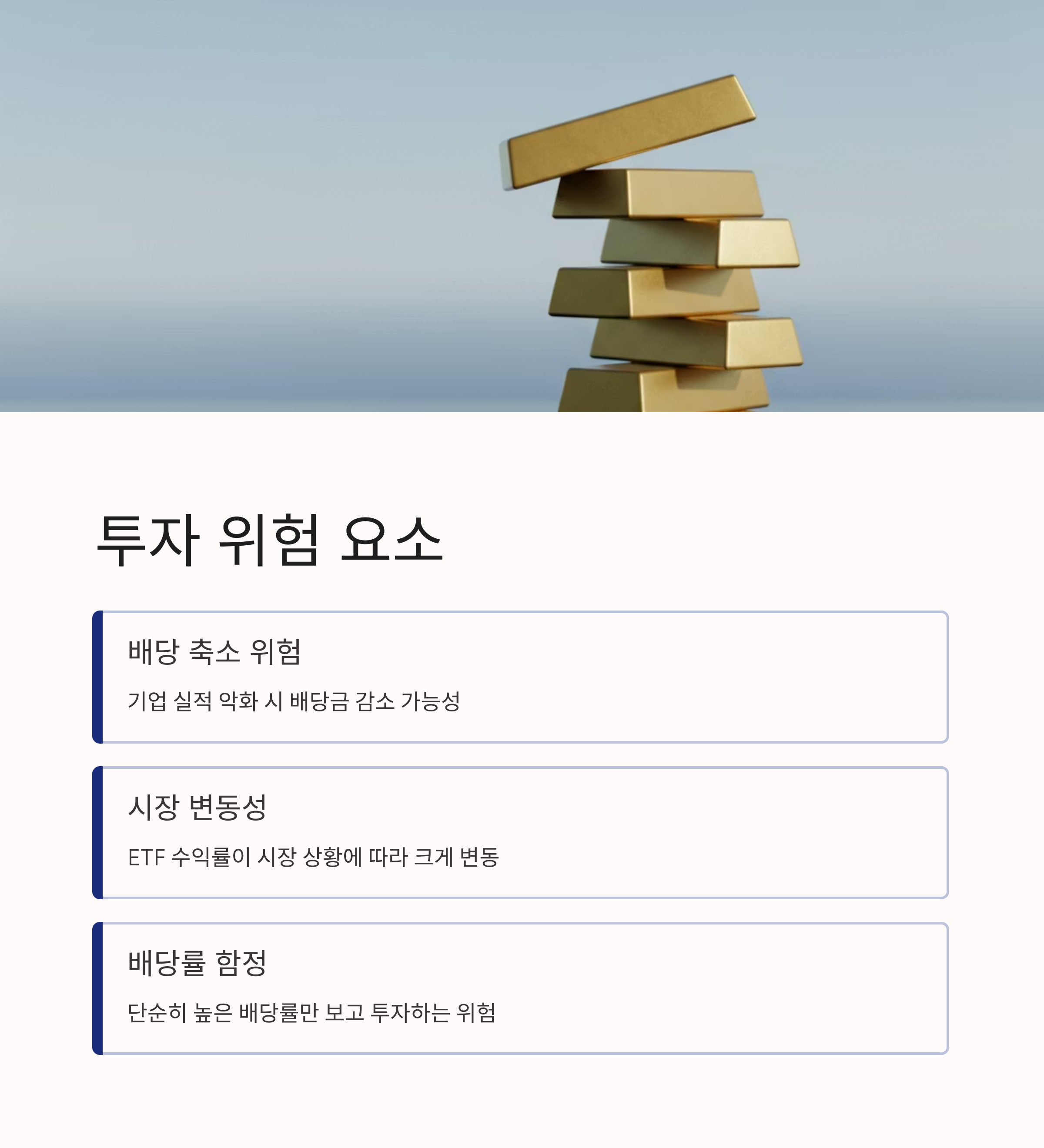 | 주의점 | 배당 축소 가능성, 시장 변동성, 세금 문제 |