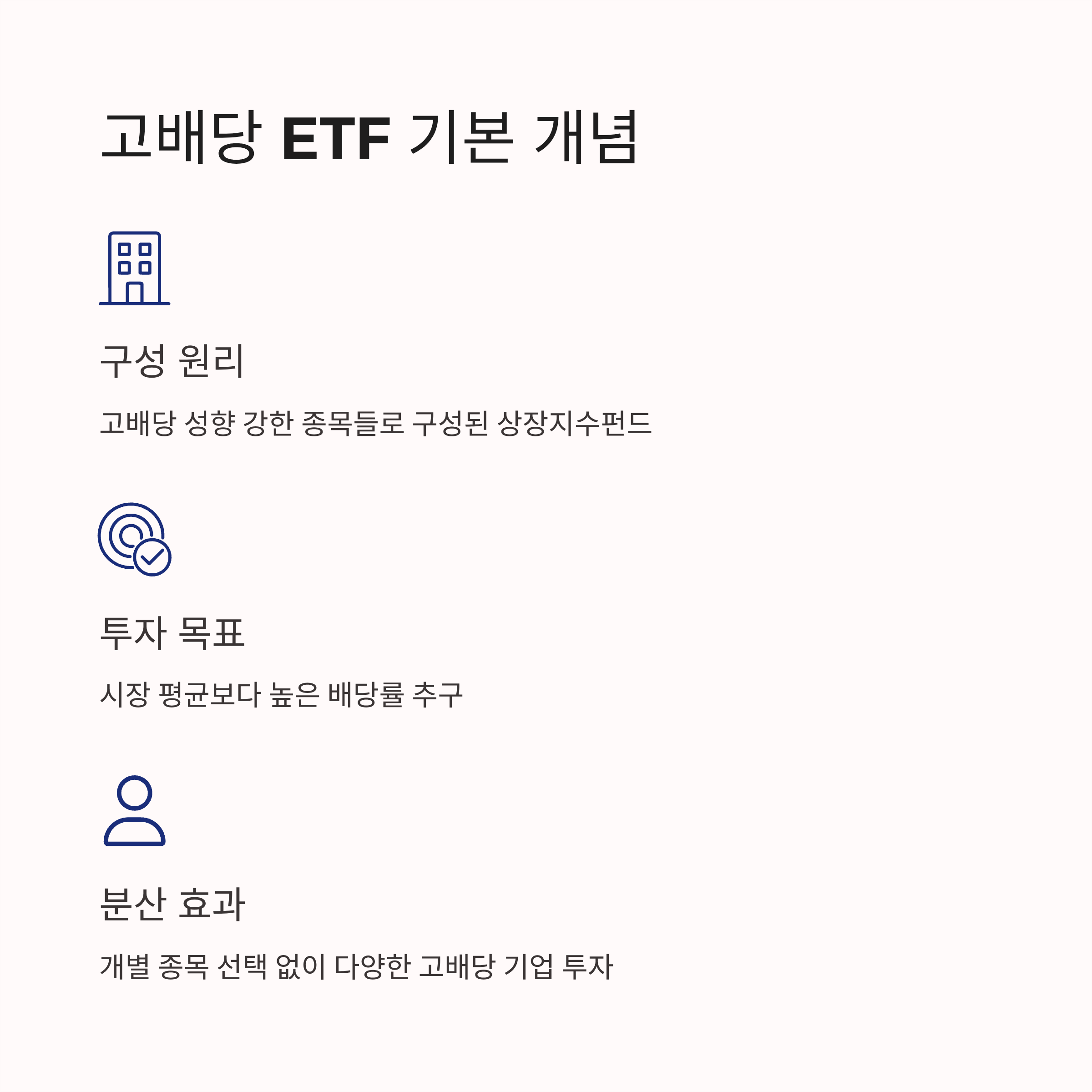 고배당 ETF는 고배당 성향이 강한 종목들을 모아 만든 펀드로, 시장 평균보다 높은 배당률을 추구합니다. 투자자는 개별 종목을 직접 고르지 않아도 다양한 고배당 기업에 분산 투자할 수 있다는 점이 장점입니다.