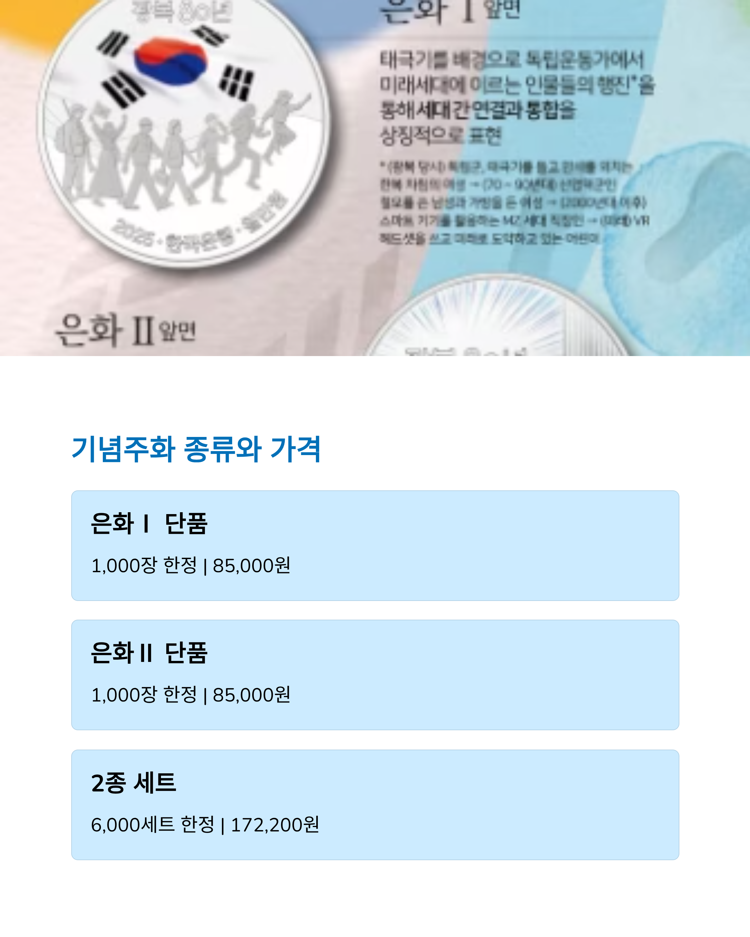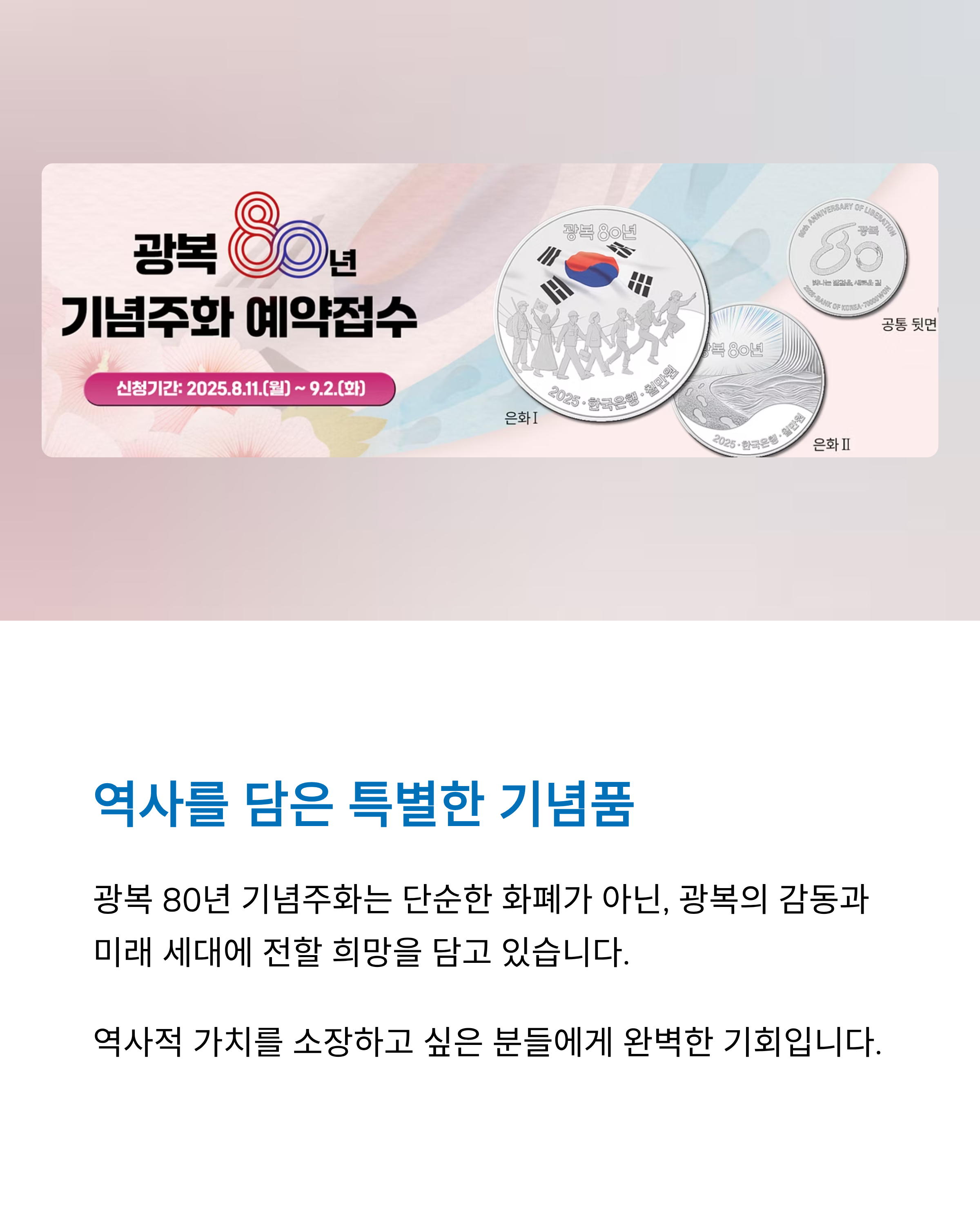 한국조폐공사가 광복 80년의 역사적 가치를 기념하는 특별 기념주화 예약 접수를
