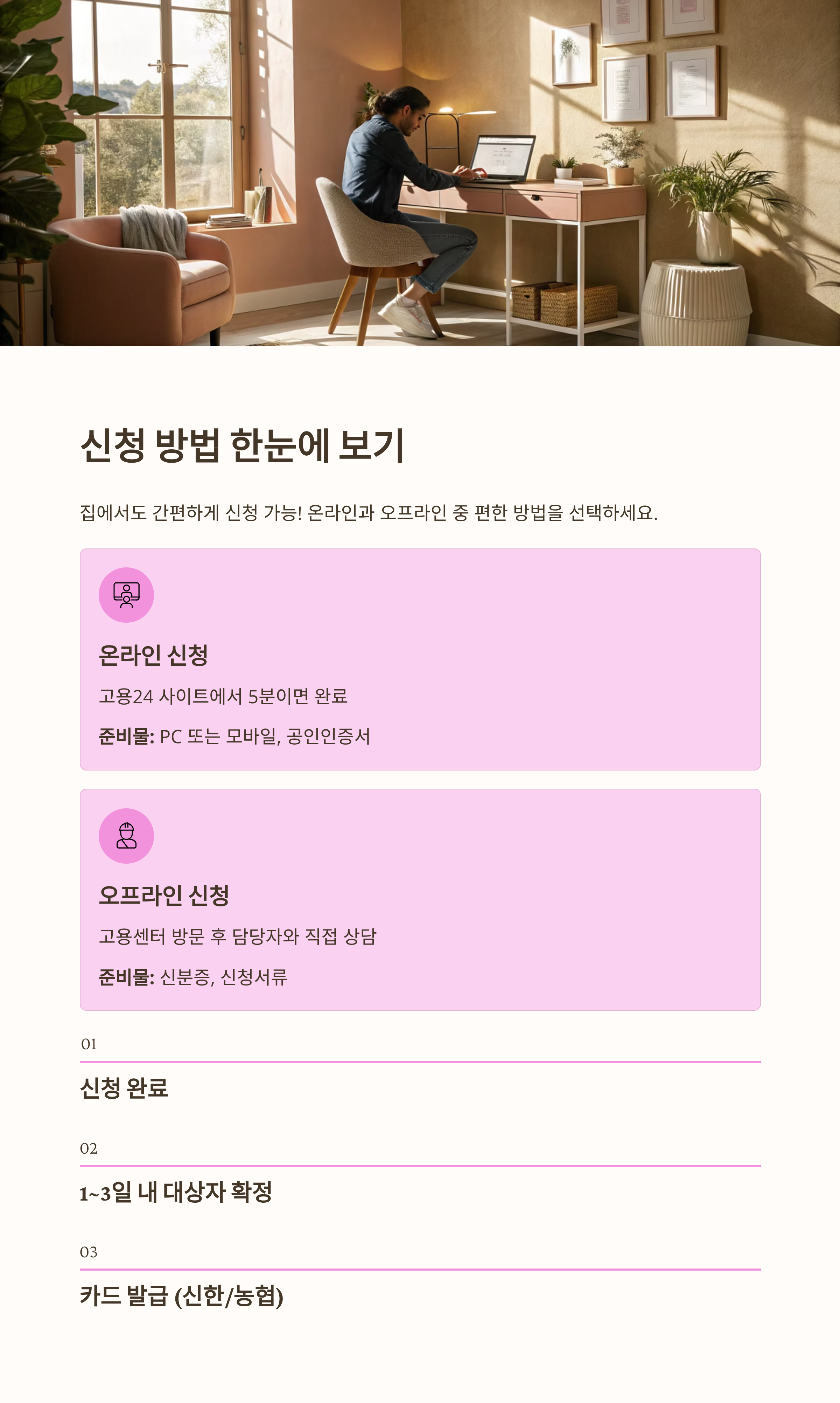 신청 후 1~3일 내에 대상자 확정 안내가 오며, 카드는 신한카드 또는 농협카드로 발급받게 됩니다.