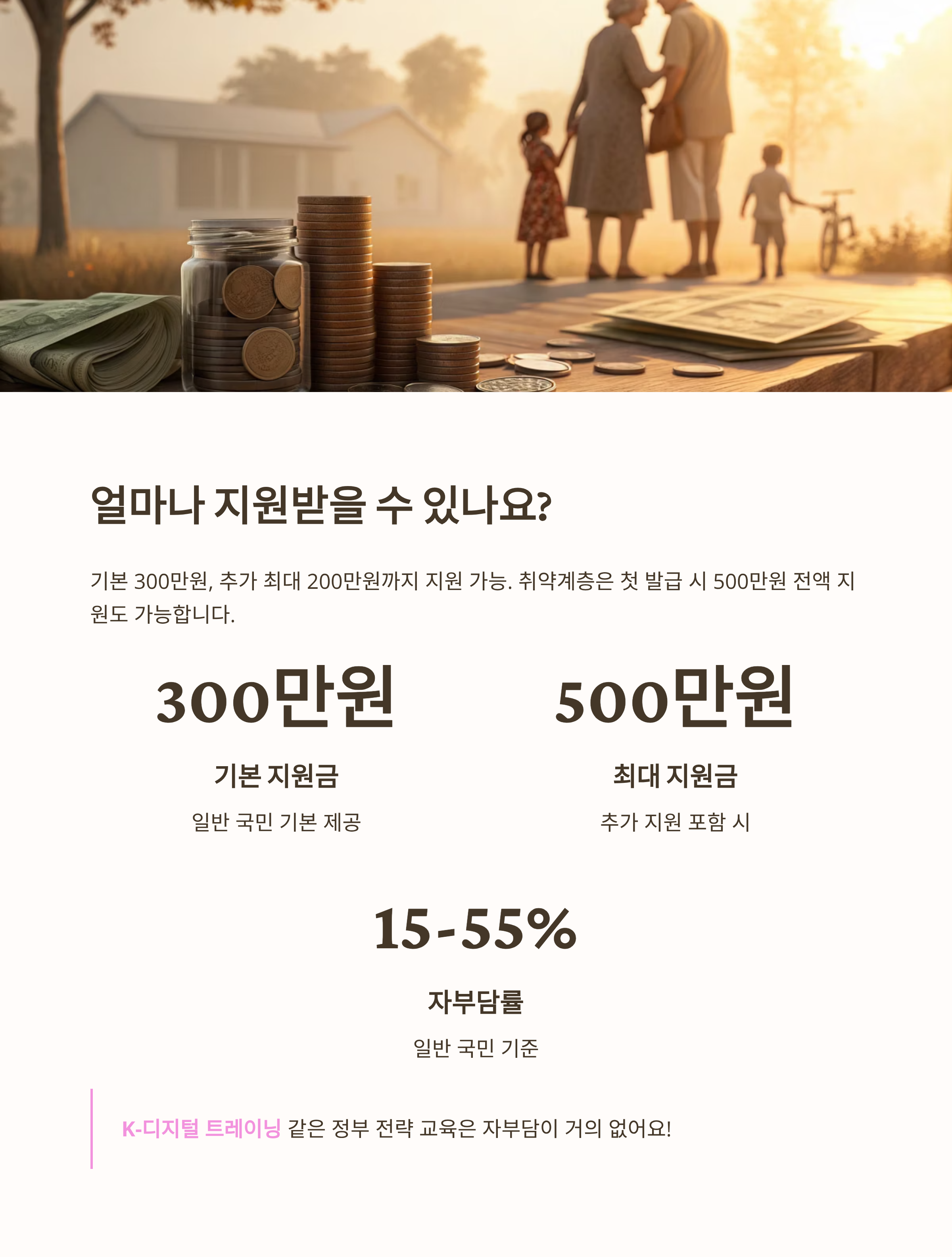 발급 후 5년간 사용 가능하며, 기본 지원금 300만원에서 추가 지원까지 받으면 최대 500만원까지 지원받을 수 있어요.