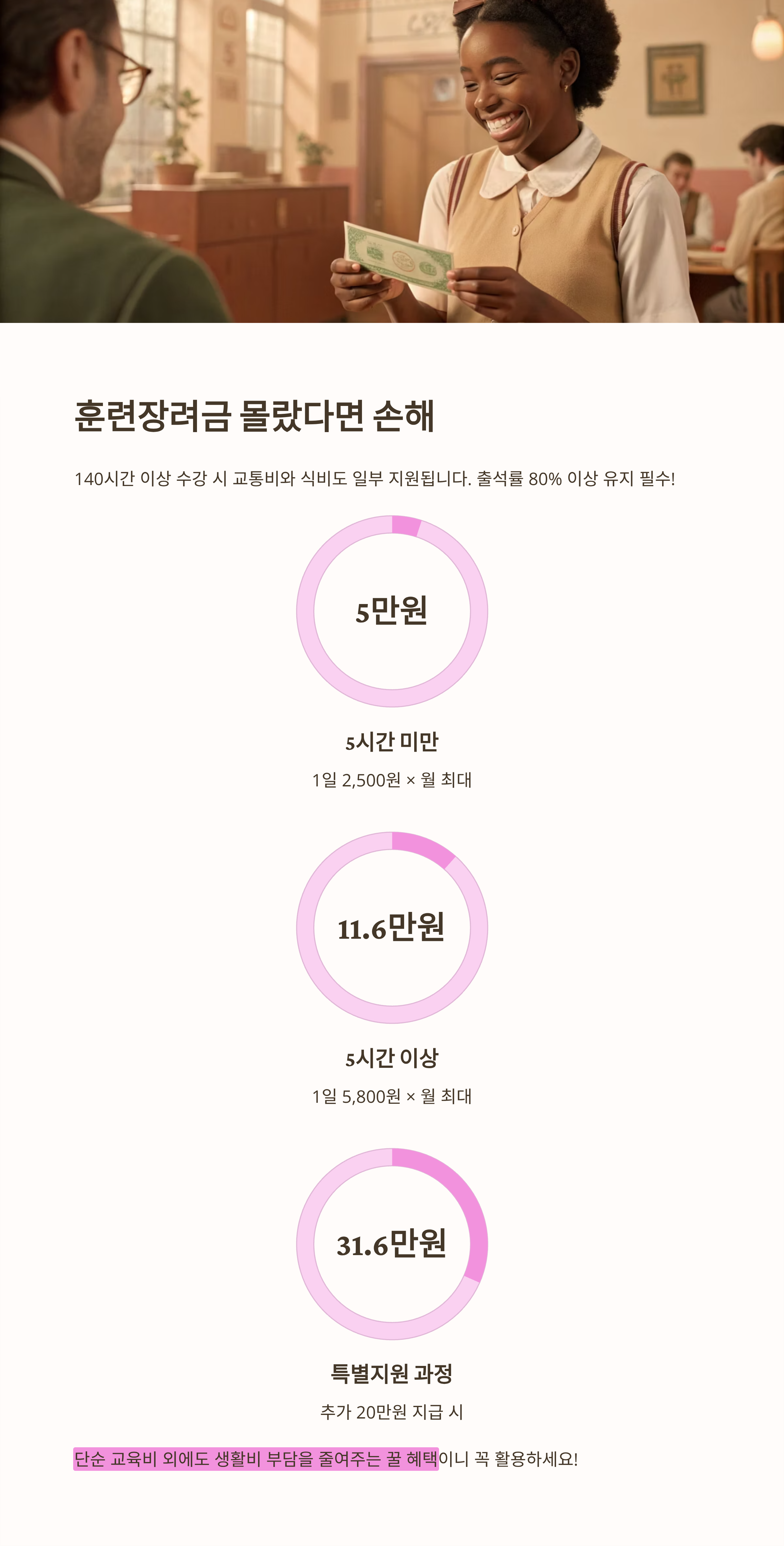 140시간 이상 수강 시 교통비와 식비도 일부 지원됩니다.