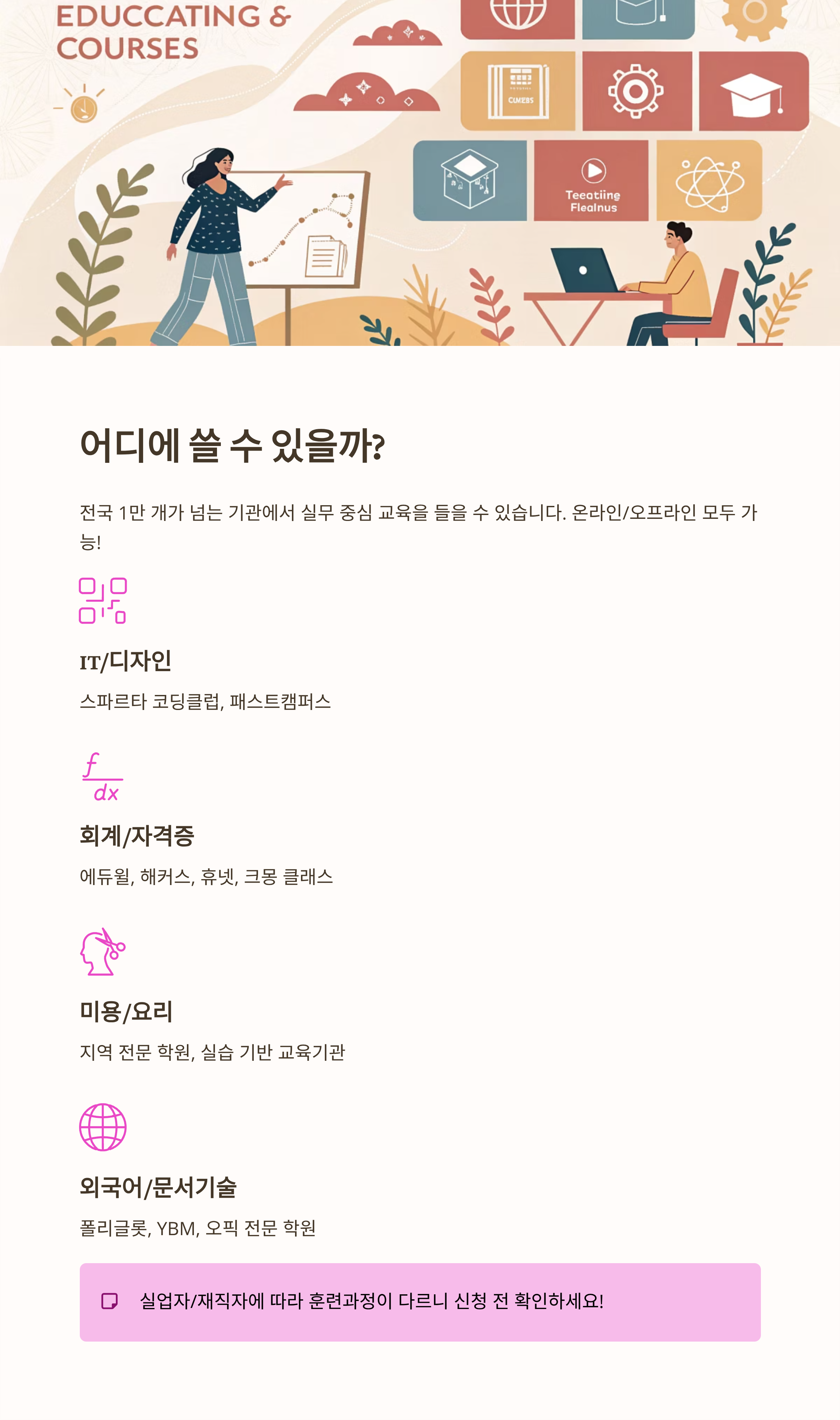 전국 1만 개가 넘는 기관에서 수업을 들을 수 있고, 실무 중심의 교육들이 가득해요.