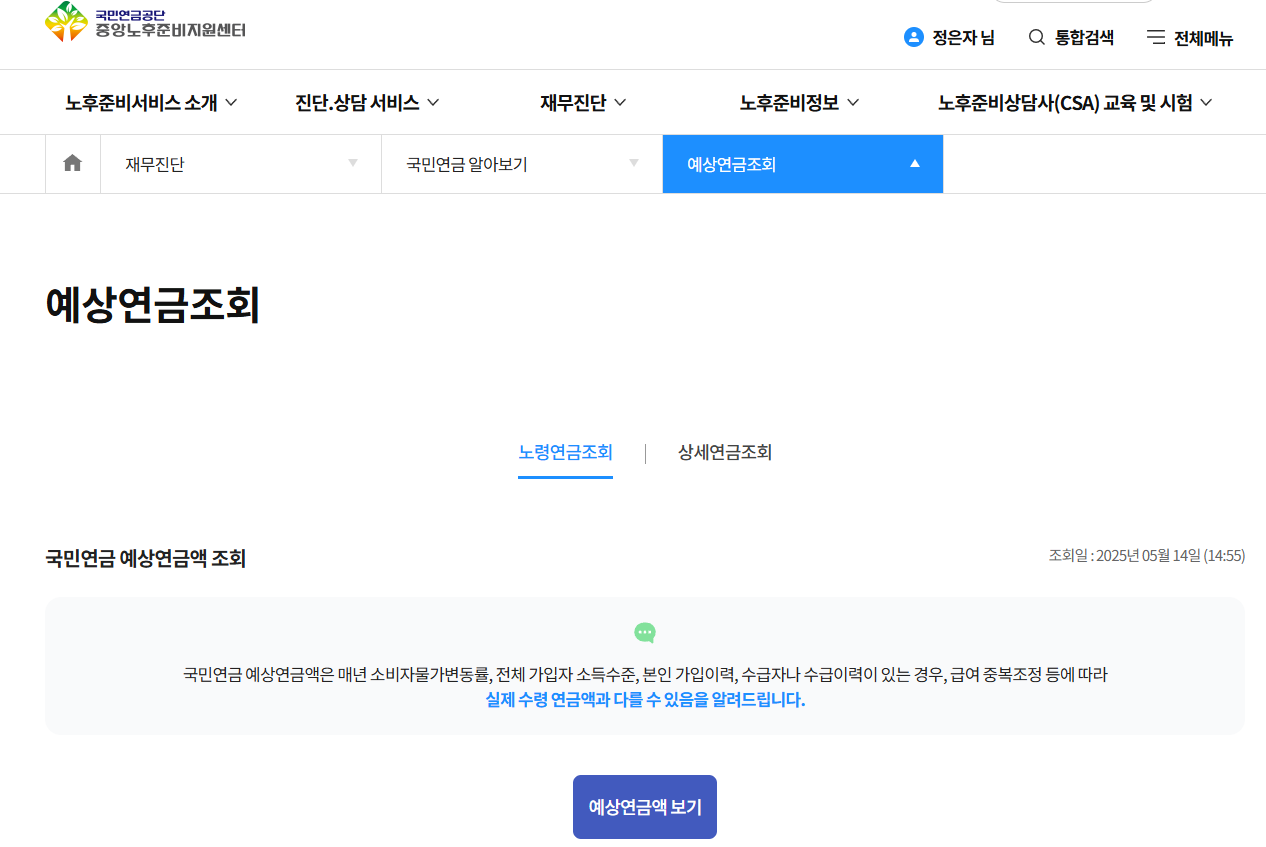 - '개인서비스' 메뉴에서 '예상연금액 조회' 선택