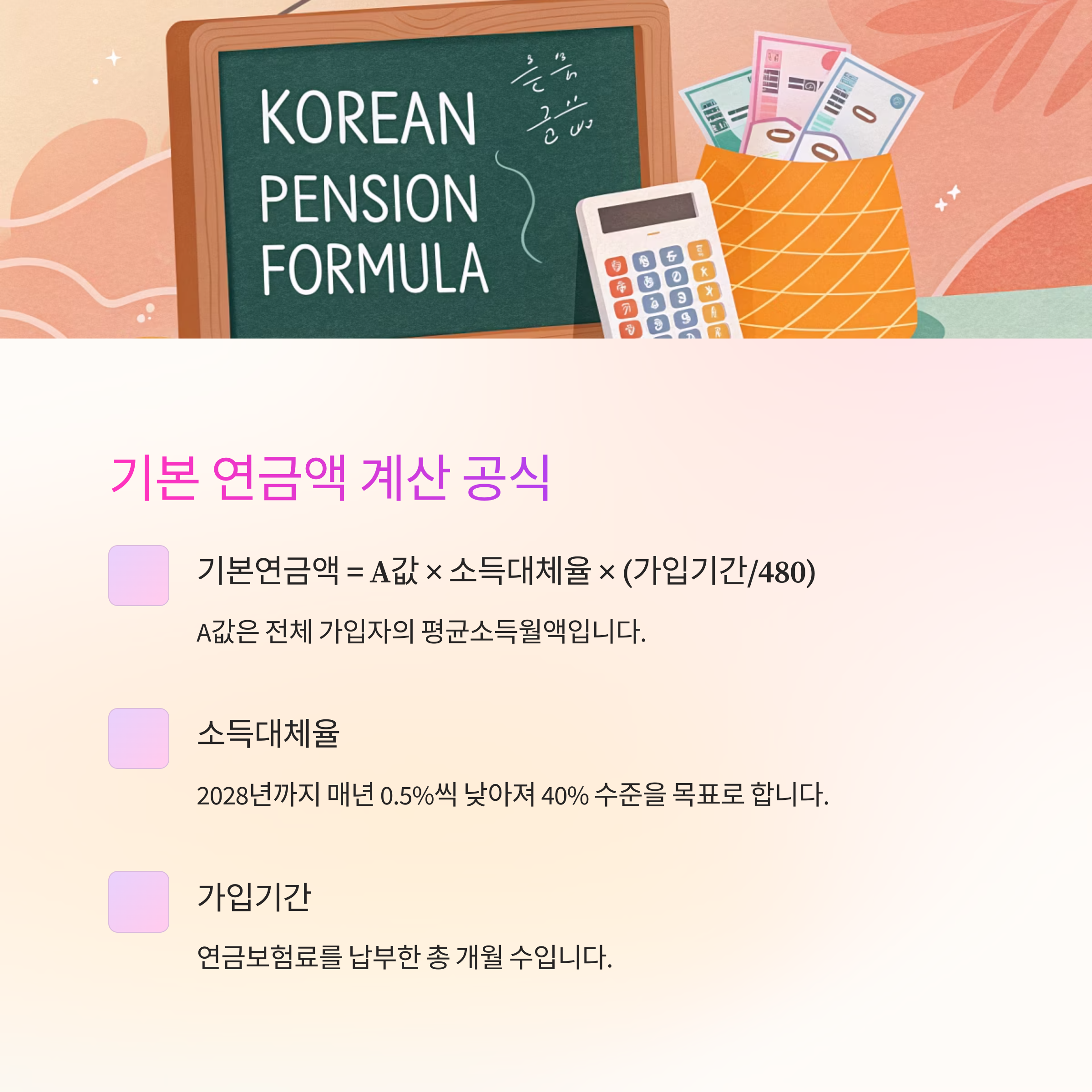기본연금액 = A값 × 소득대체율 × (가입기간 / 480개월)