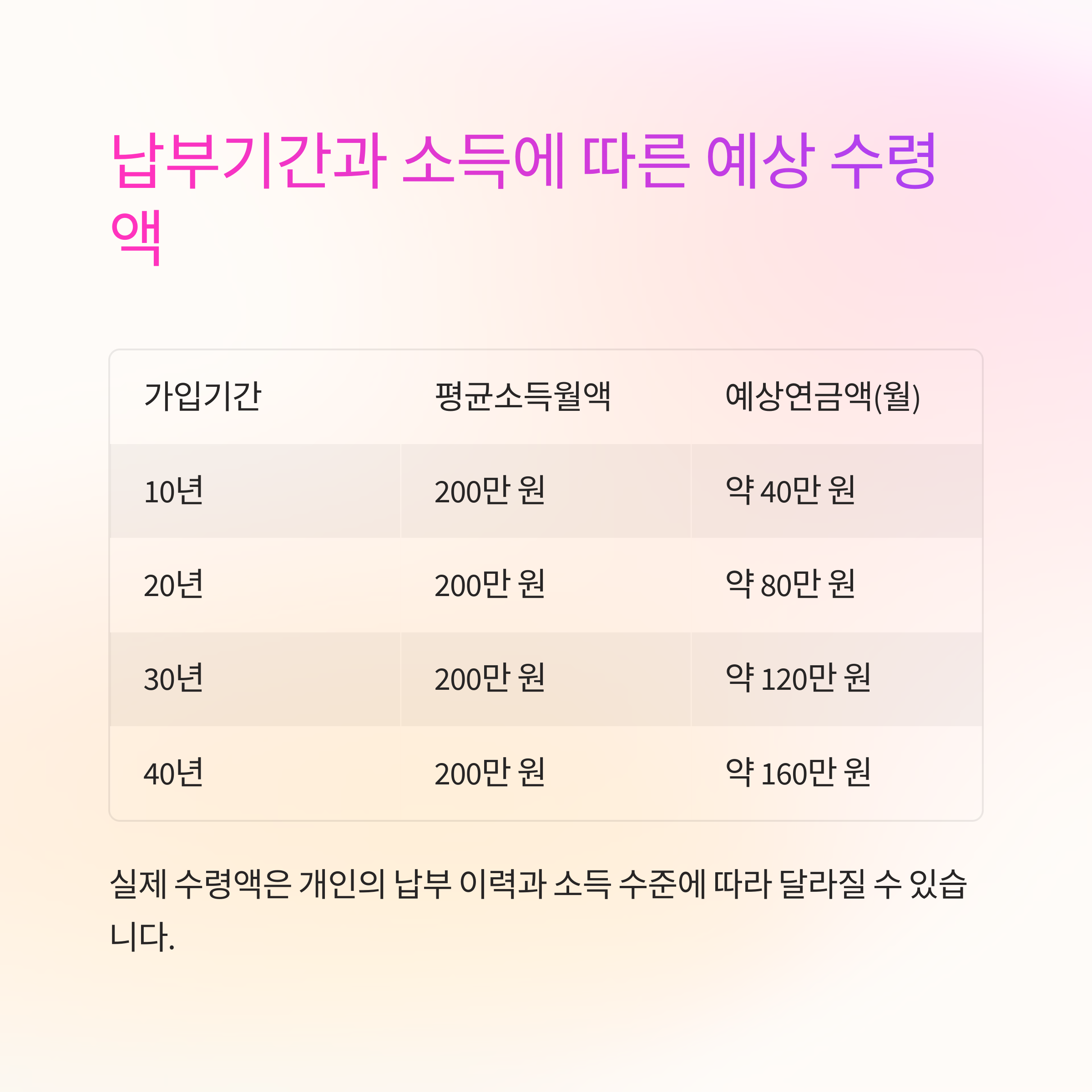 위 예시는 단순화를 위한 가정이며, 실제 수령액은 개인의 납부 이력과 소득 수준에 따라 달라질 수 있습니다.