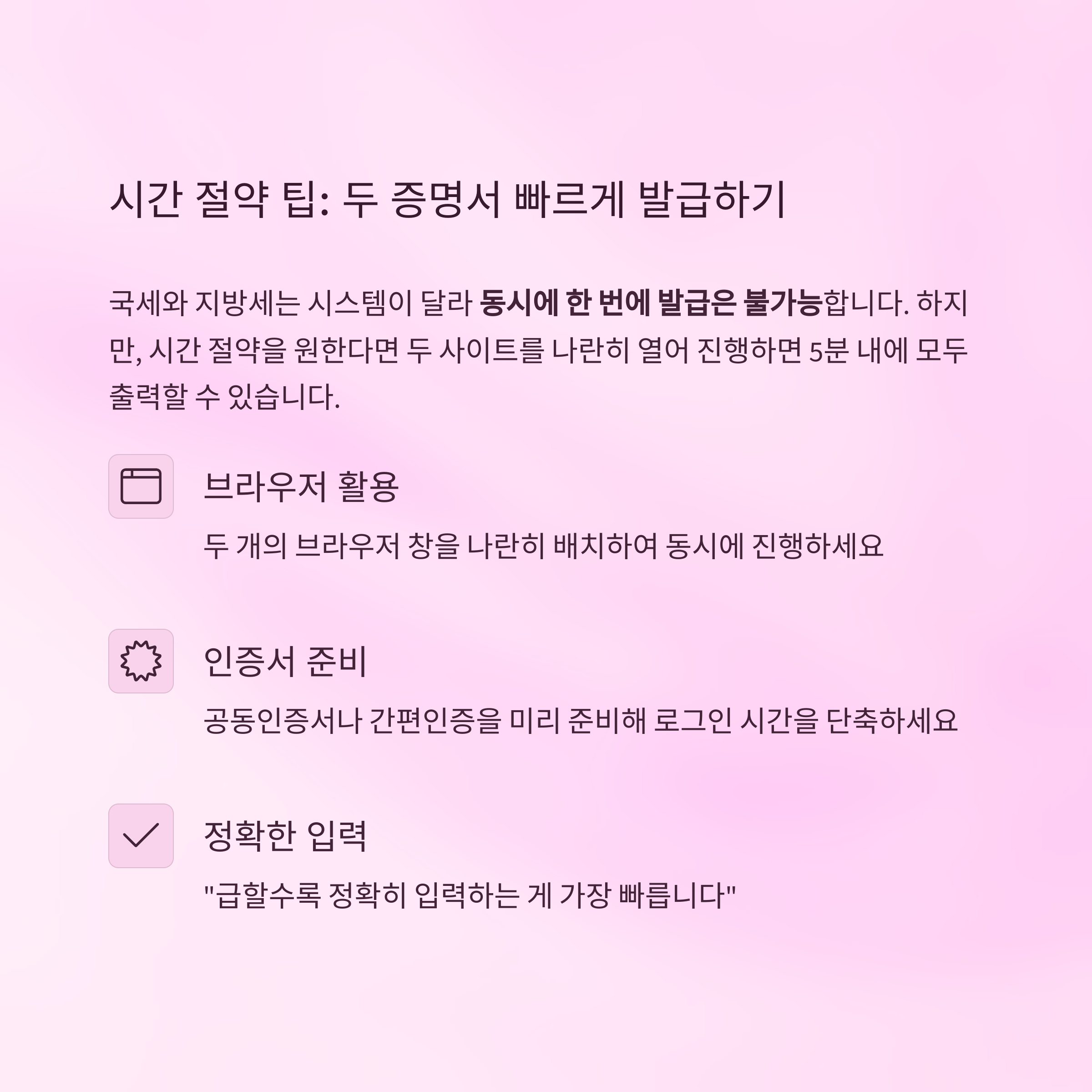 | 지방세 | 위택스, 정부24 | 공동인증서, 간편인증 등 |