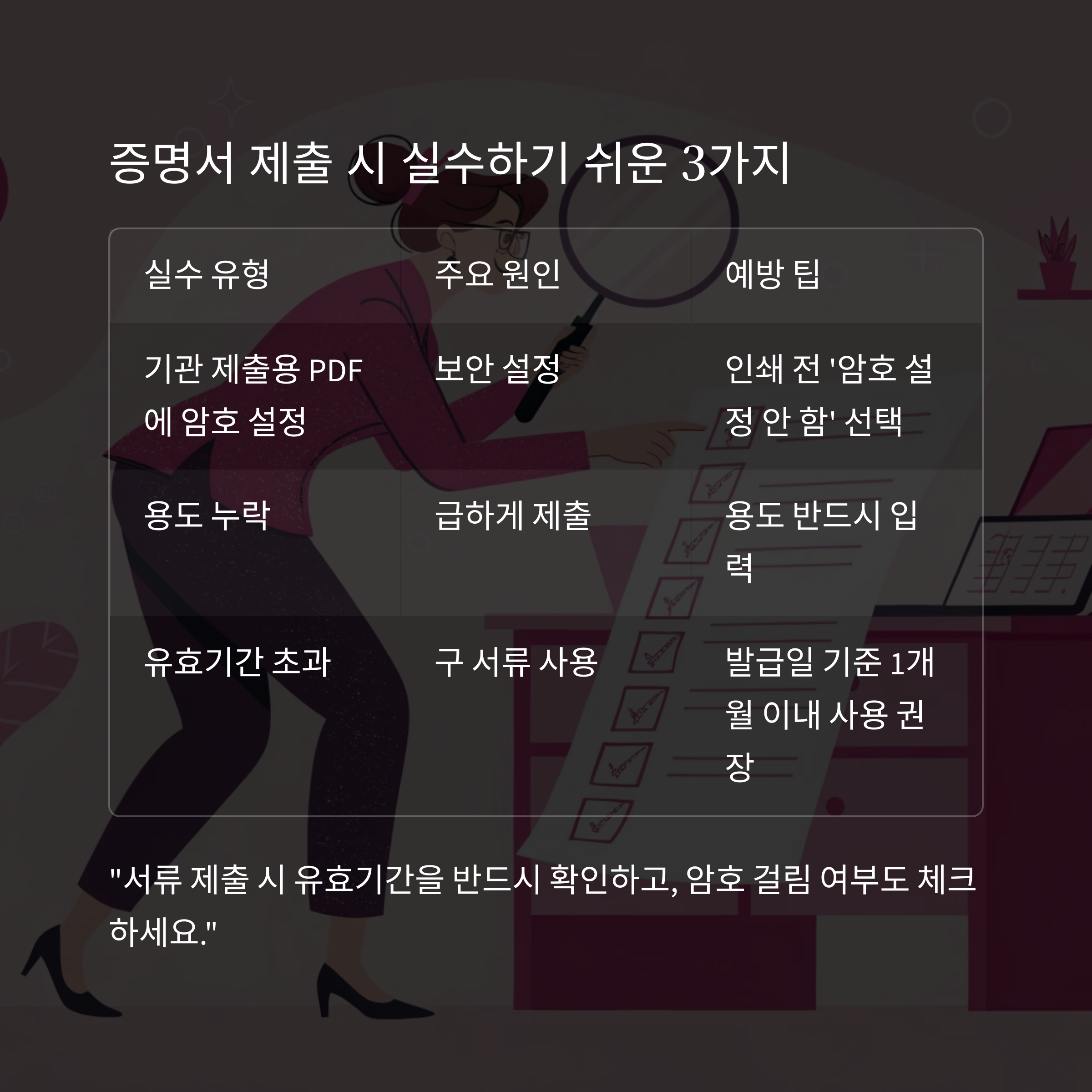"서류 제출 시 유효기간을 반드시 확인하고, 암호 걸림 여부도 체크하세요."