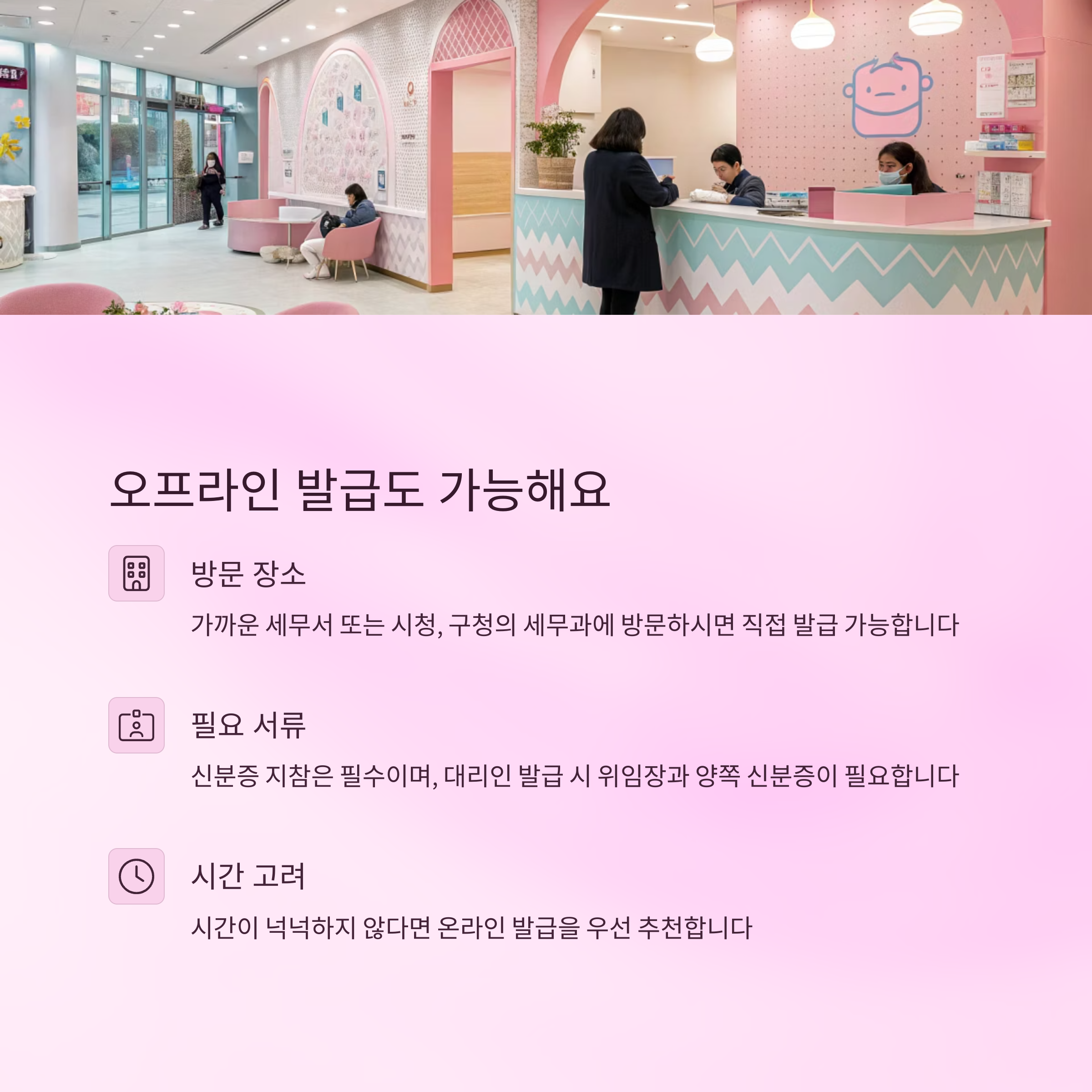 직접 발급도 가능합니다. 신분증 지참은 필수이며, 대리인 발급 시 위임장과