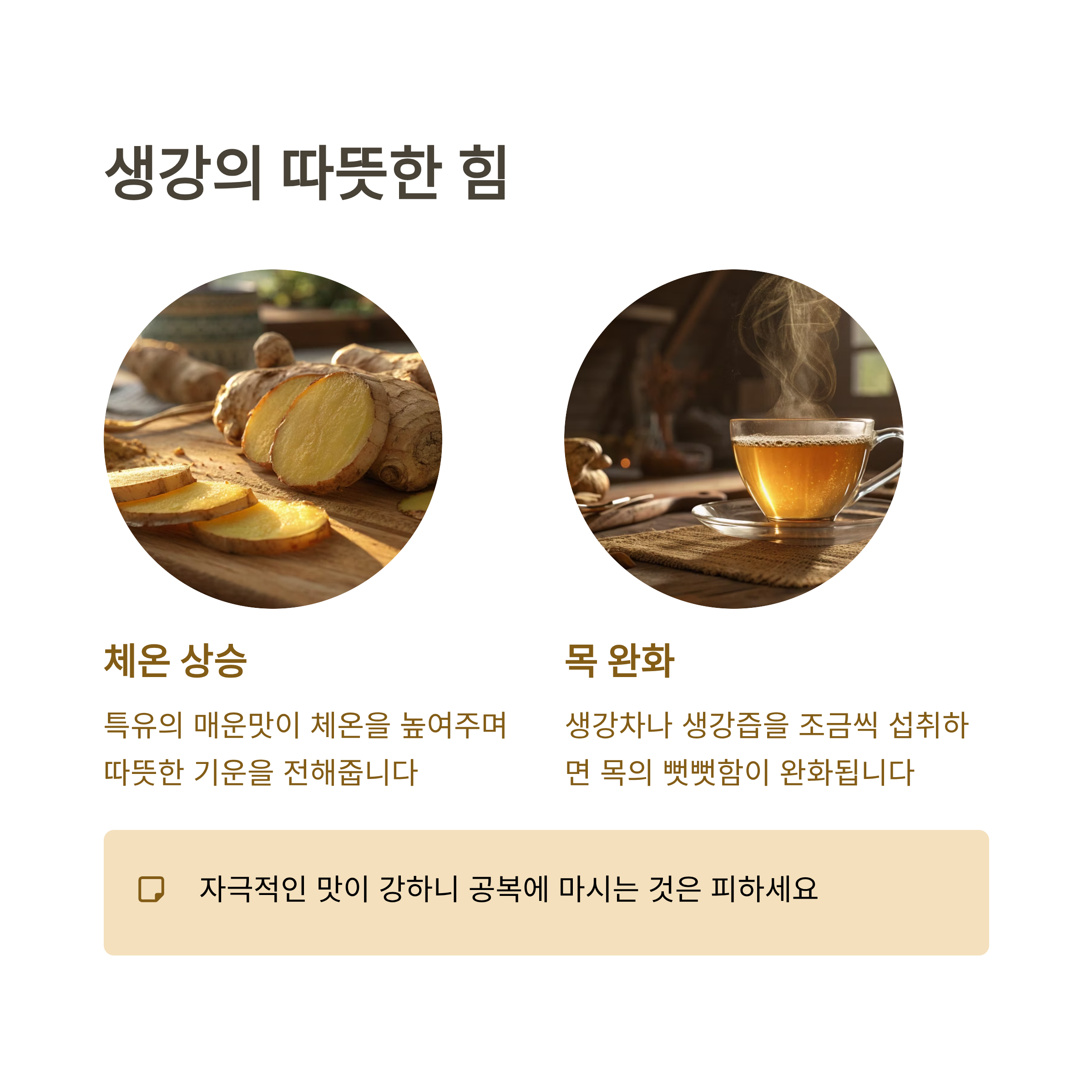 생강은 특유의 매운맛이 체온을 높여주며, 따뜻한 기운을 전해줍니다. 생강차나 생강즙을 조금씩 섭취하면 목의 뻣뻣한 느낌이 완화되는 경우가 많습니다. 다만 자극적인 맛이 강하니 공복에 마시는 것은 피하는 것이 좋습니다.