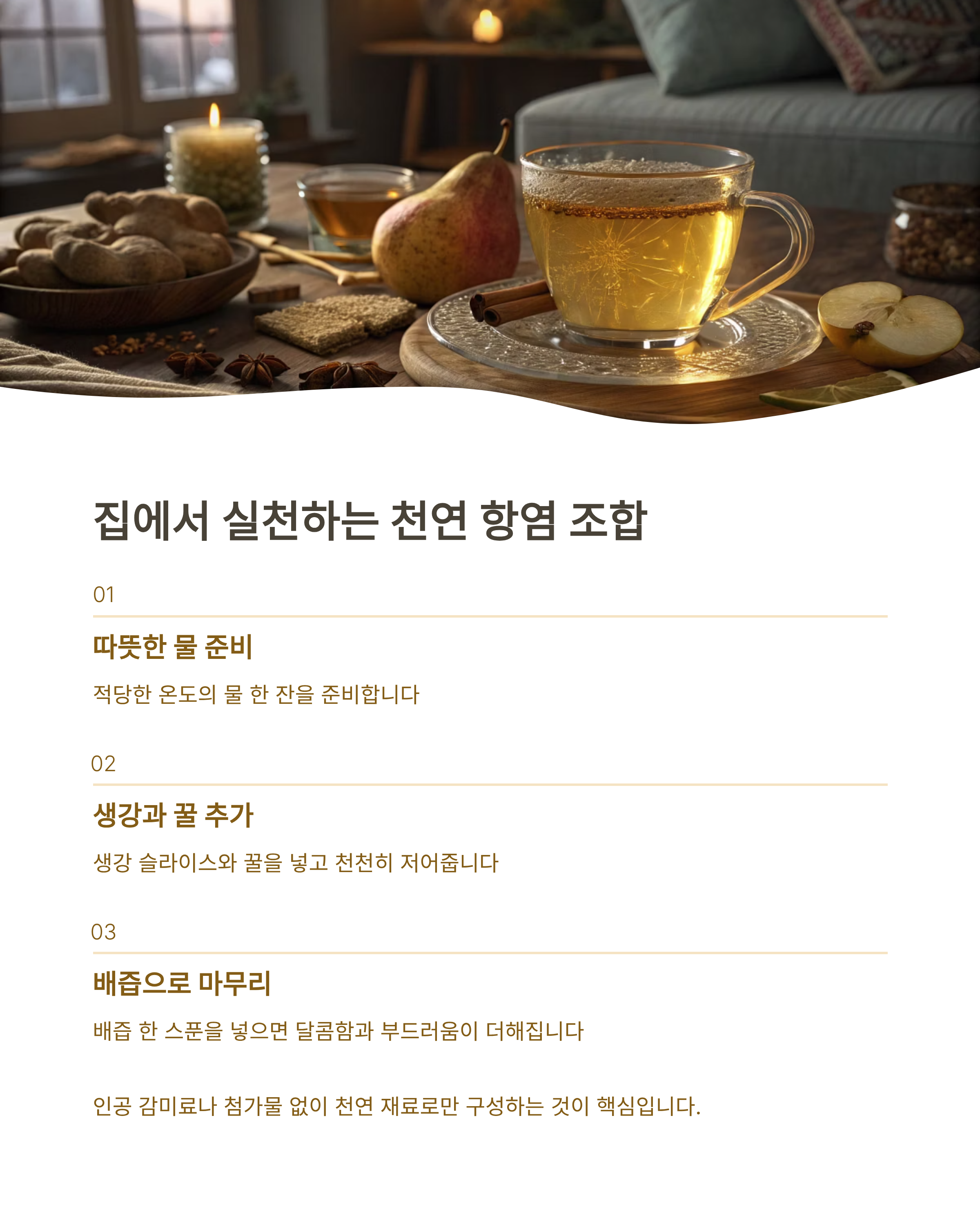 따뜻한 물 한 잔에 생강 슬라이스와 꿀을 넣고 천천히 마셔보세요. 여기에 배즙을 한 스푼 넣으면 달콤한 맛과 부드러움이 더해집니다. 인공 감미료나 첨가물이 들어가지 않은 천연 재료로 구성하는 것이 핵심입니다.