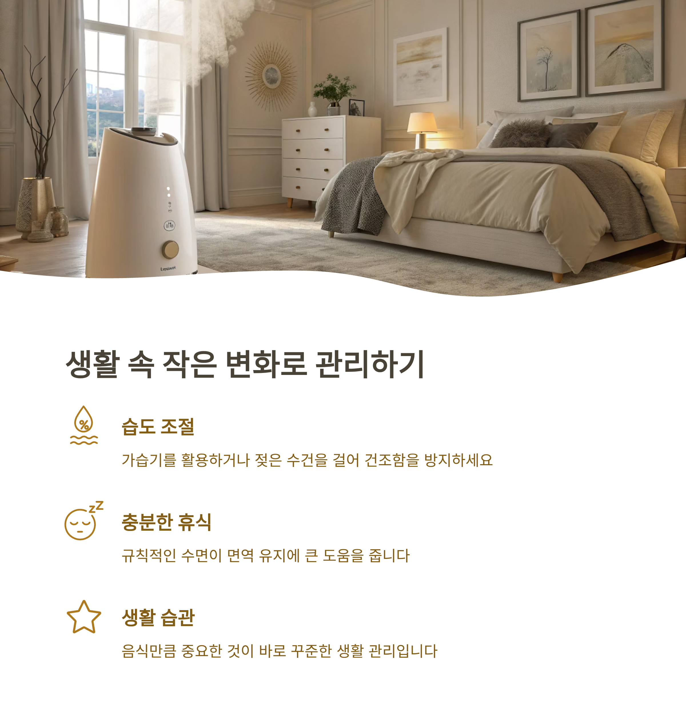 습도 조절은 목 건강의 기본입니다. 건조한 실내에서는 가습기를 활용하거나 젖은 수건을 걸어 두는 것도 좋은 방법입니다. 또한 충분한 휴식과 규칙적인 수면이 면역 유지에 큰 도움을 줍니다. 음식만큼 중요한 것이 바로 생활 습관입니다.