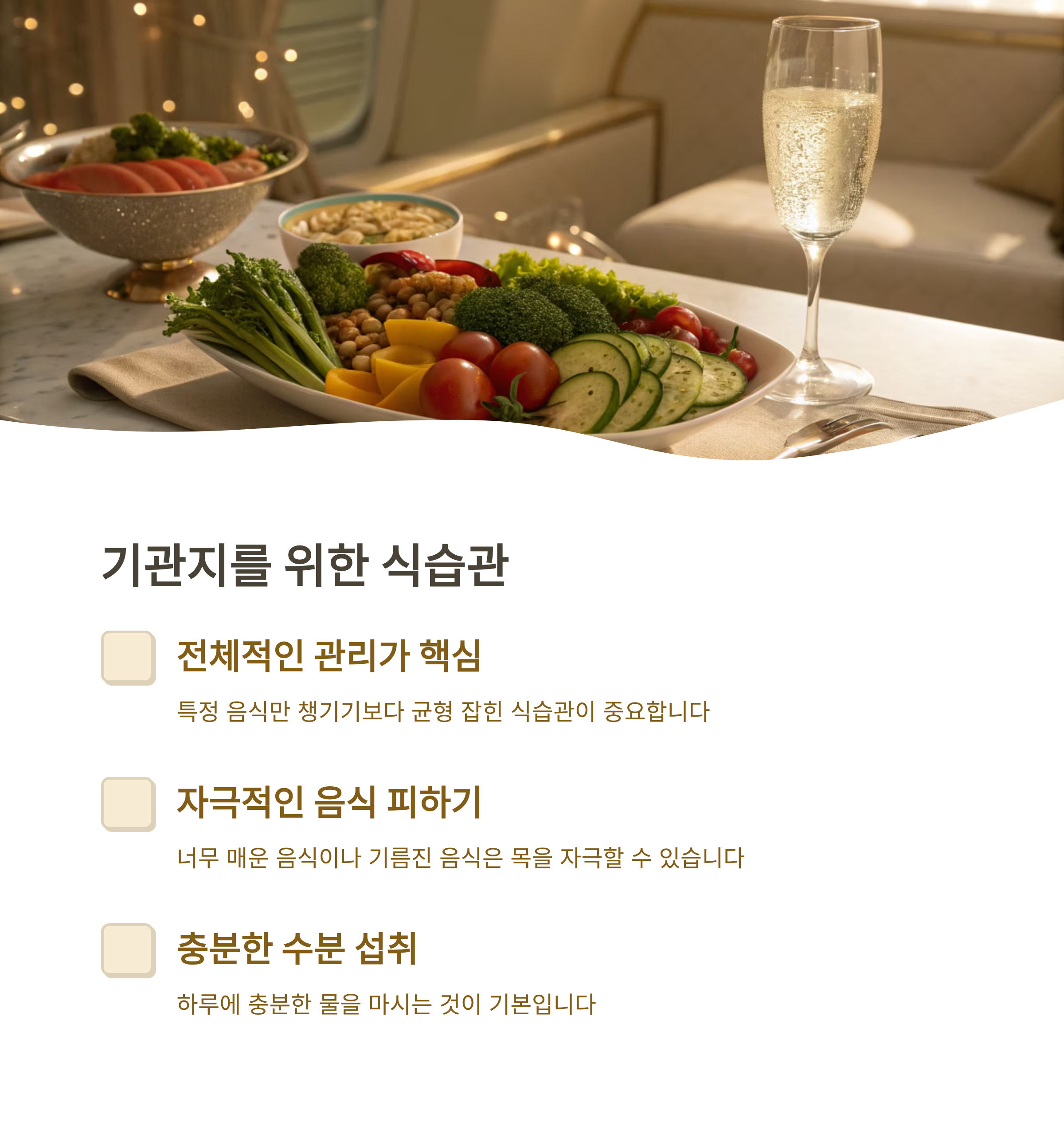 기관지 건강을 지키기 위해서는 특정 음식만 챙기기보다 전체적인 식습관 관리가 중요합니다. 너무 매운 음식이나 기름진 음식은 목을 자극할 수 있으므로 피하는 것이 좋고, 하루에 충분한 수분을 섭취하는 것이 기본입니다.