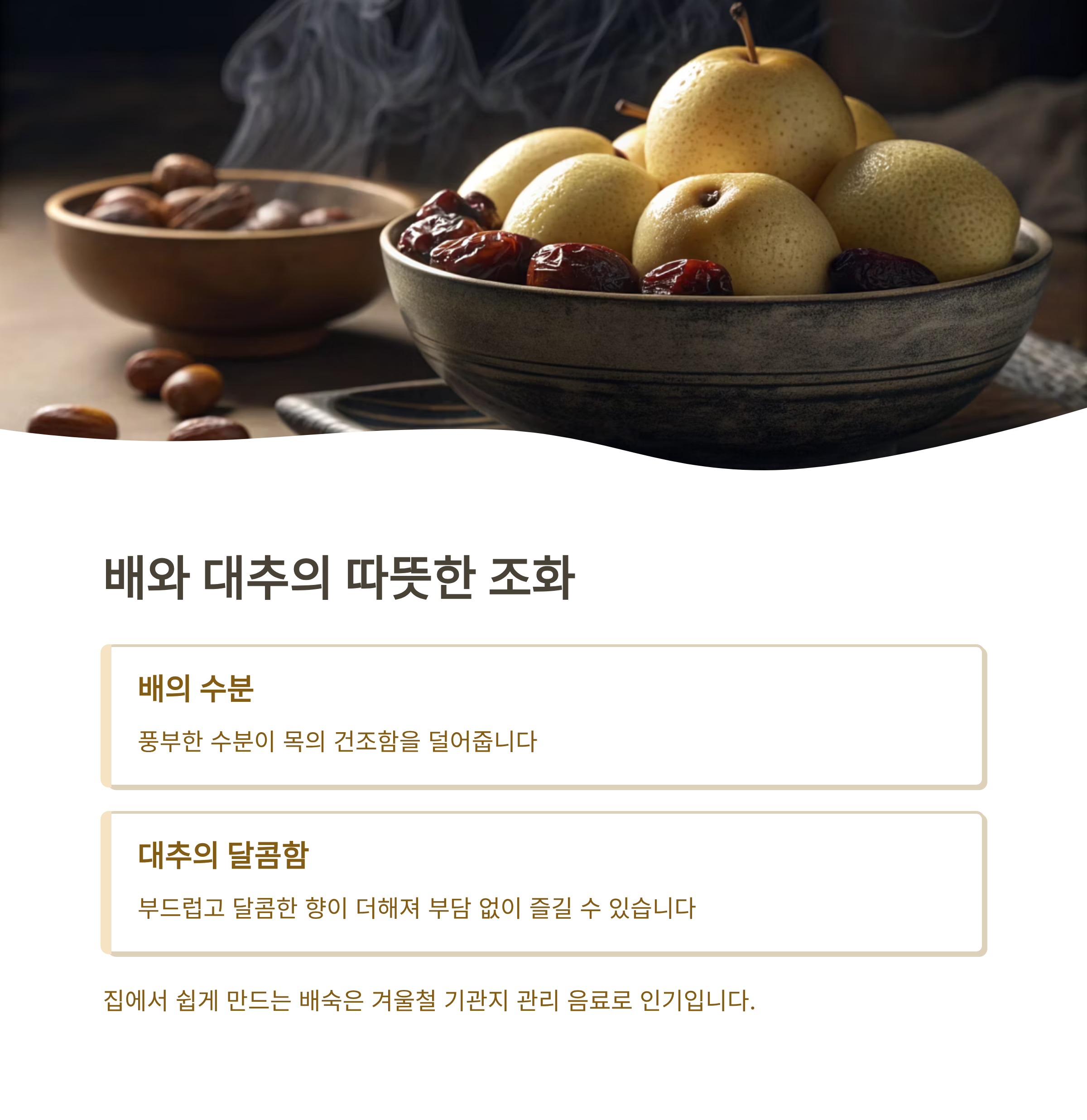 배에는 수분이 풍부해 목의 건조함을 덜어주는 데 도움을 줍니다. 여기에 대추를 함께 끓여 마시면 부드럽고 달콤한 향이 더해져 부담 없이 즐길 수 있습니다. 집에서도 쉽게 만들 수 있는 배숙은 겨울철 자주 찾게 되는 기관지 관리 음료로 꼽힙니다.