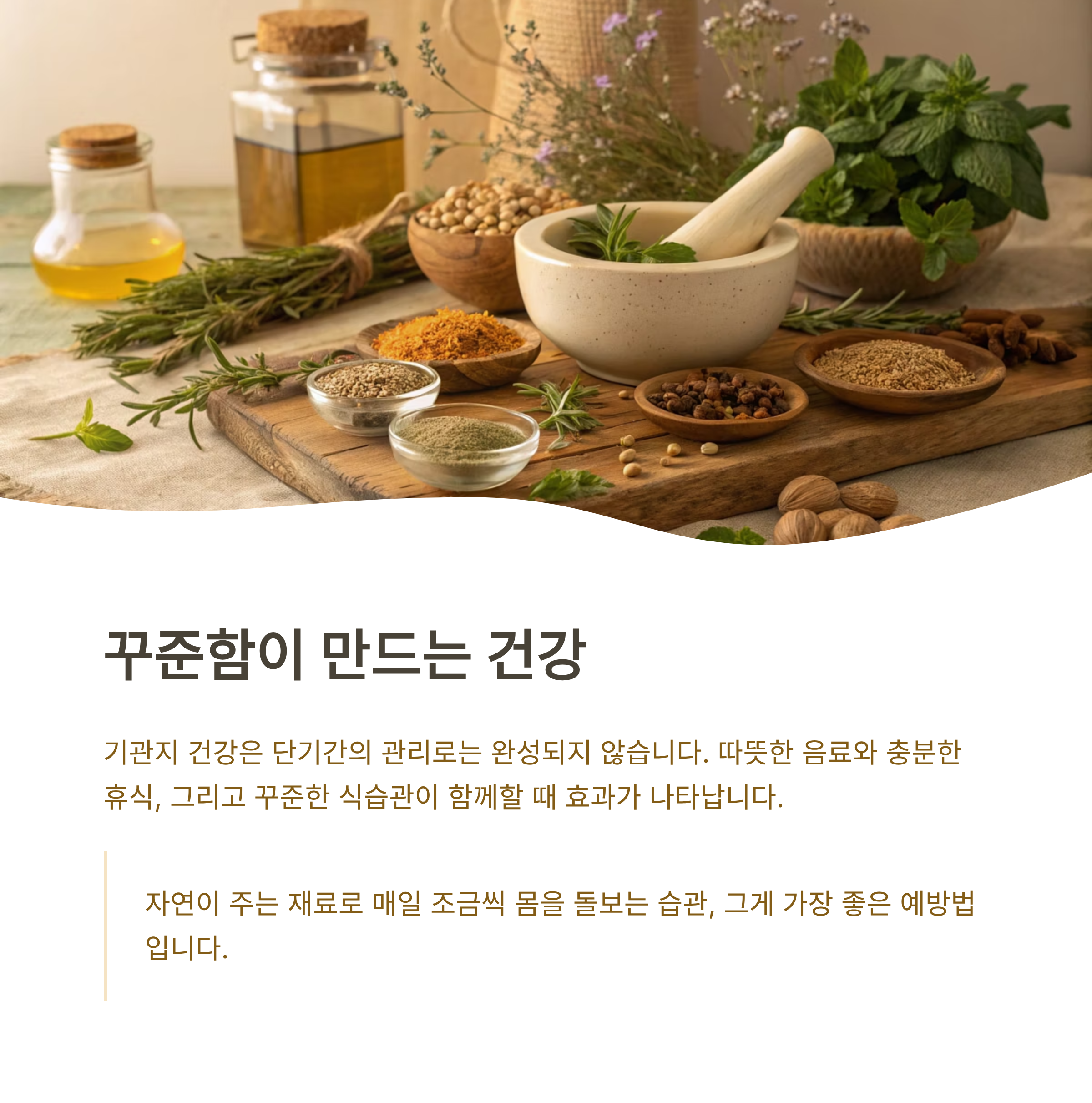 기관지 건강은 단기간의 관리로는 완성되지 않습니다. 꾸준한 식습관과 따뜻한 음료, 그리고 충분한 휴식이 함께할 때 그 효과가 서서히 나타납니다. 자연이 주는 재료로 매일 조금씩 몸을 돌보는 습관, 그게 가장 좋은 예방법일지도 모릅니다.