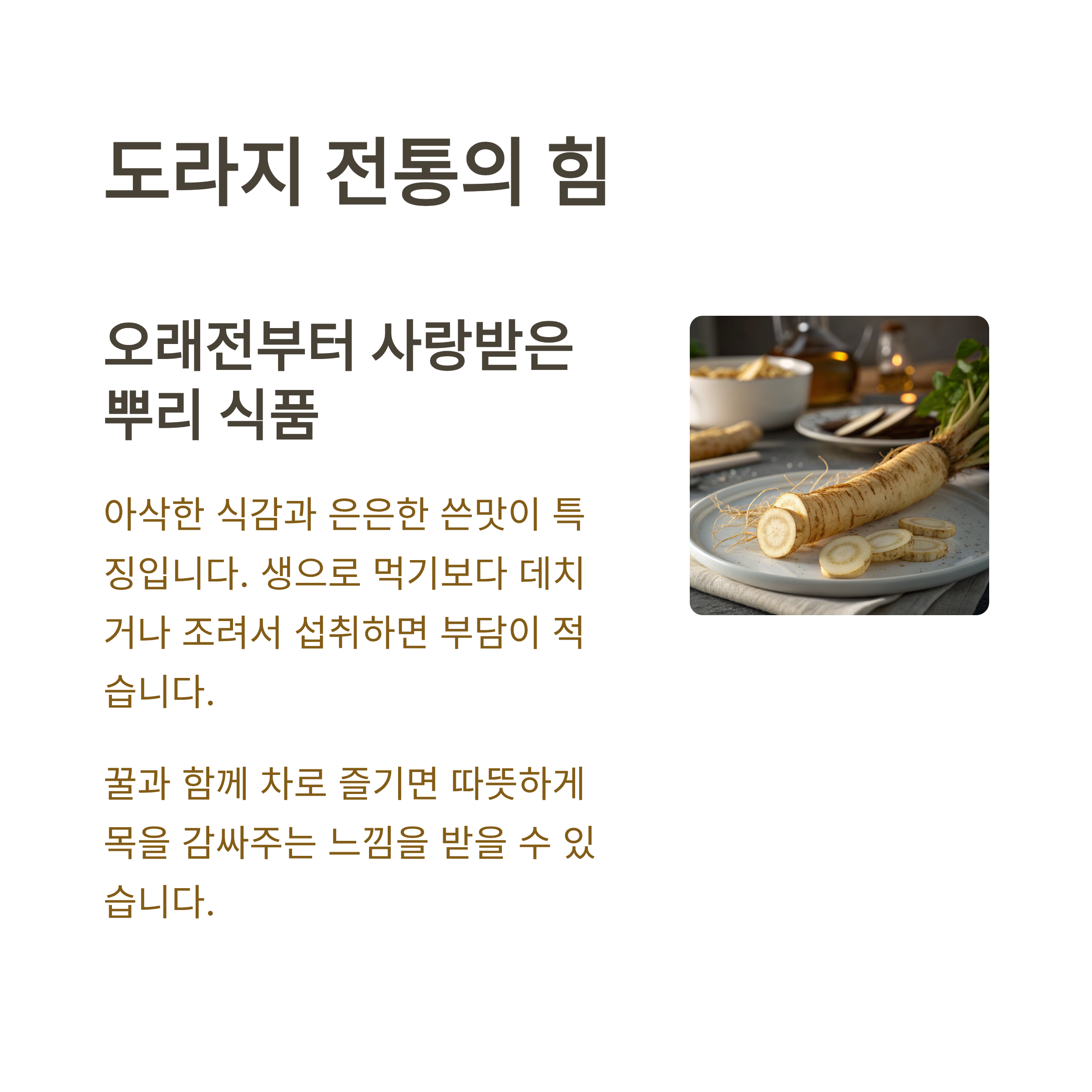 | 도라지 | 쌉쌀한 맛, 기관지 관리 전통 식품 | 도라지차, 도라지조림 |
