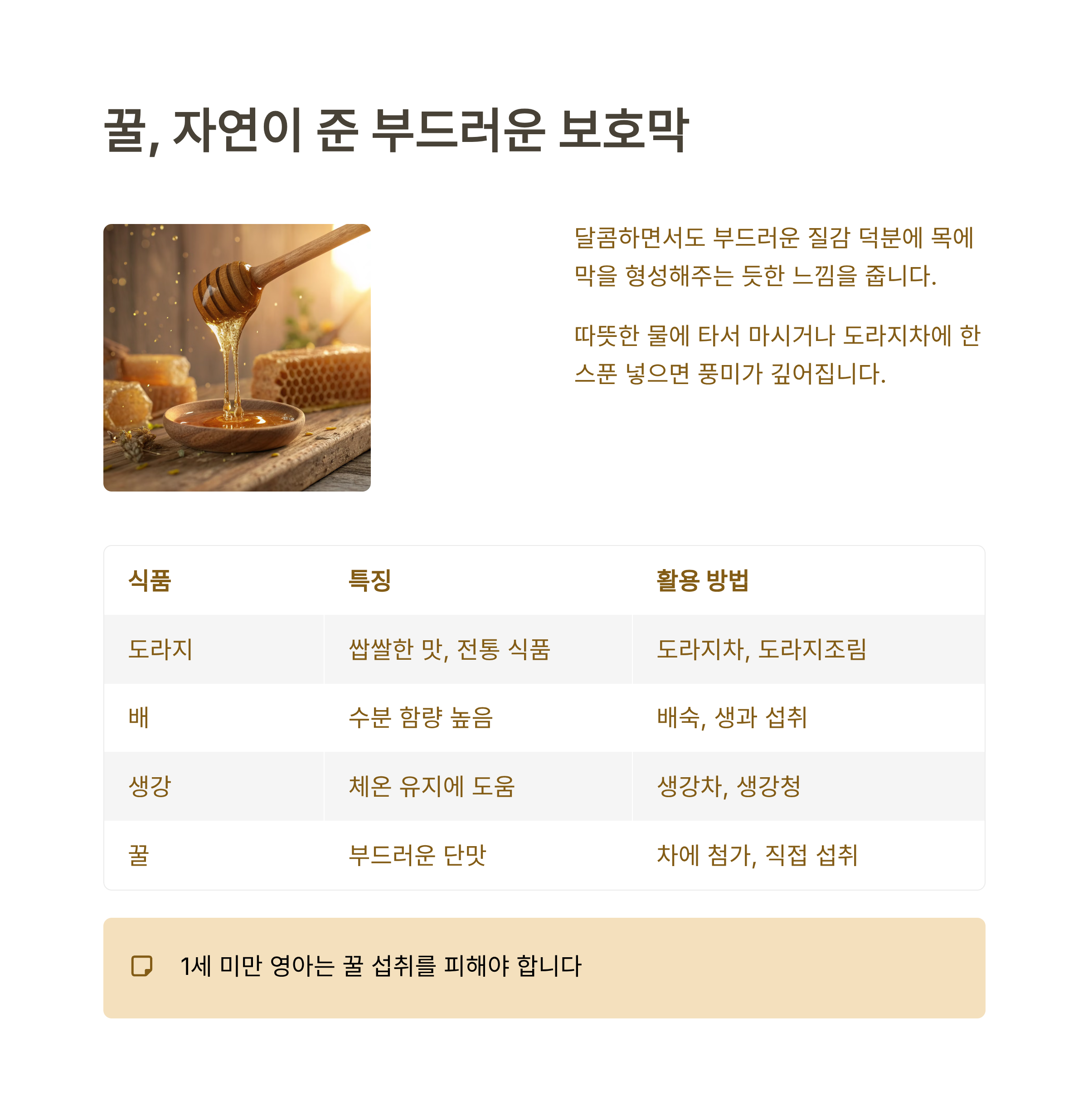 꿀은 달콤하면서도 부드러운 질감 덕분에 목에 막을 형성해주는 듯한 느낌을 줍니다. 따뜻한 물에 타서 마시거나 도라지차에 한 스푼 넣으면 풍미가 훨씬 깊어집니다. 단, 1세 미만의 영아는 꿀을 섭취하지 않도록 주의해야 합니다.