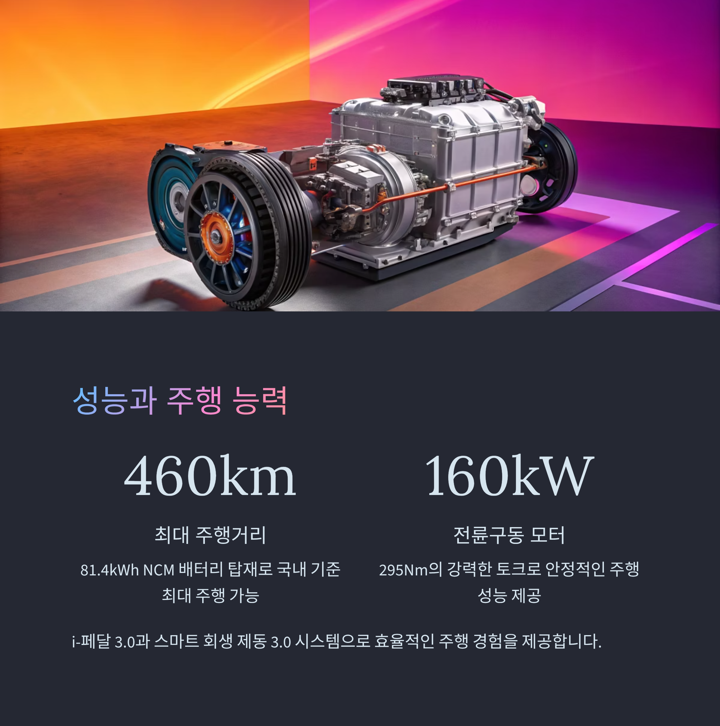 EV5는 81.4kWh NCM 배터리를 탑재하여 최대 460km(국내 기준)를 주행할 수 있으며, 160kW 전륜구동 모터가 295Nm의 힘을 발휘합니다. i-페달 3.0과 스마트 회생 제동 3.0 시스템은 효율적인 주행 경험을 제공합니다.