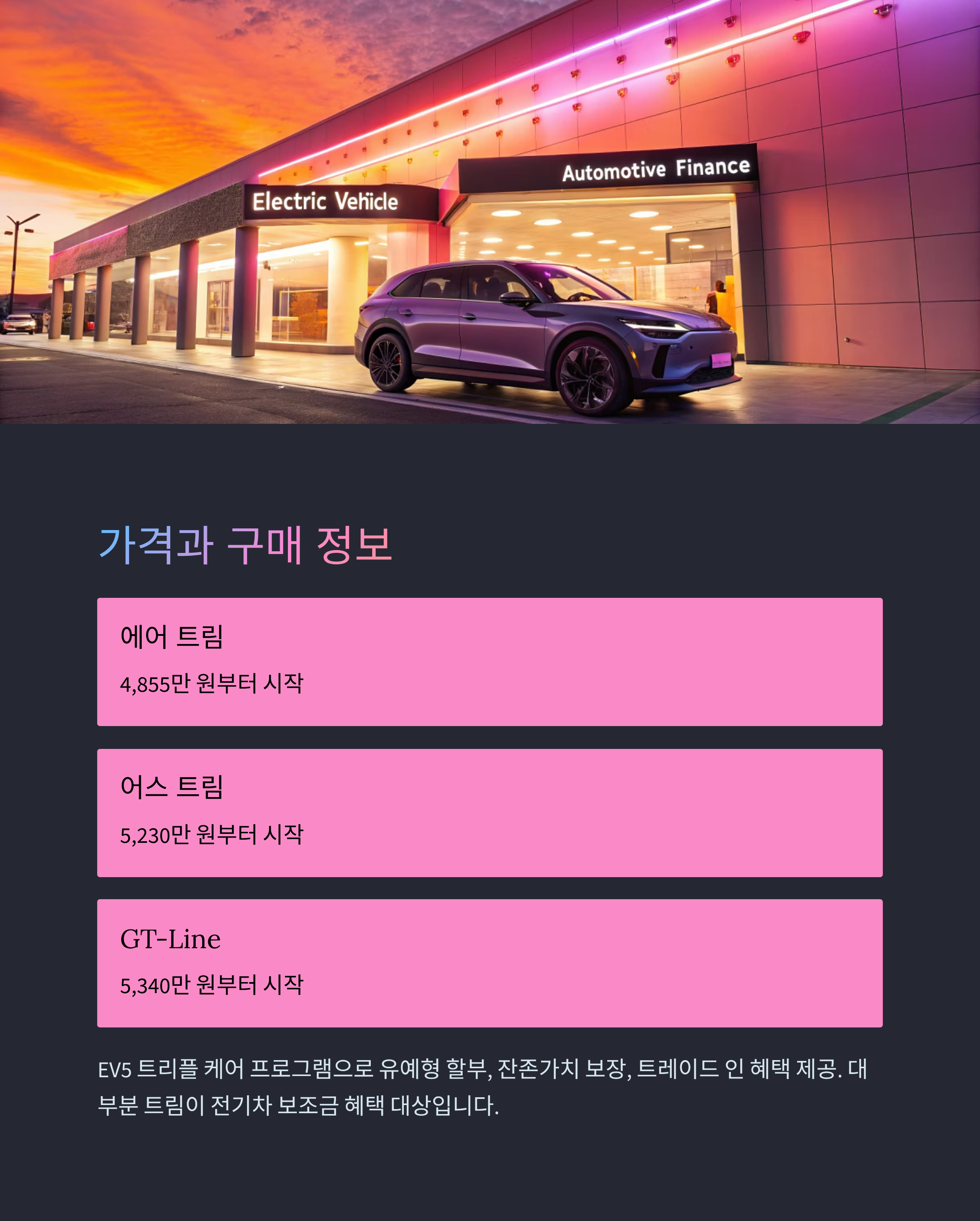 롱레인지 기준으로 에어 트림은 4,855만 원, 어스 트림은 5,230만 원, GT-Line은 5,340만 원부터 시작합니다. 또한 EV5 트리플 케어 프로그램을 통해 유예형 할부, 잔존가치 보장, 트레이드 인 혜택을 받을 수 있어 구매 부담을 줄일 수 있습니다. 대부분의 트림이 전기차 보조금 혜택을 받을 수 있는 5,300만 원 이하 가격대에 맞춰져 있다는 점도 핵심 포인트입니다.