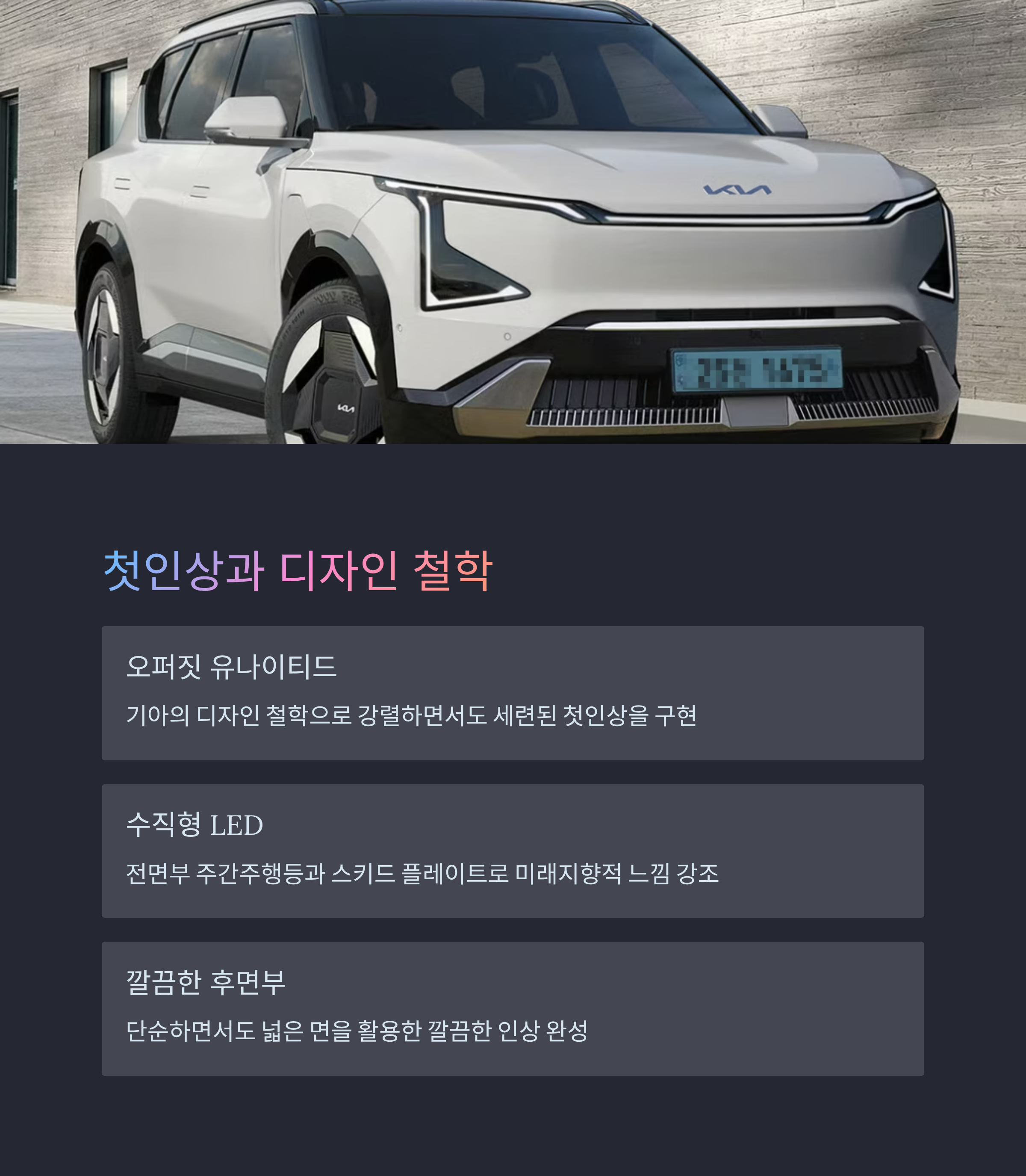 EV5는 기아의 '오퍼짓 유나이티드' 디자인 철학을 바탕으로 강렬하면서도 세련된 첫인상을 줍니다. 전면부의 수직형 LED 주간주행등과 스키드 플레이트는 미래지향적인 느낌을 강조하고, 후면부는 단순하면서도 넓은 면을 활용해 깔끔한 인상을 완성했습니다.