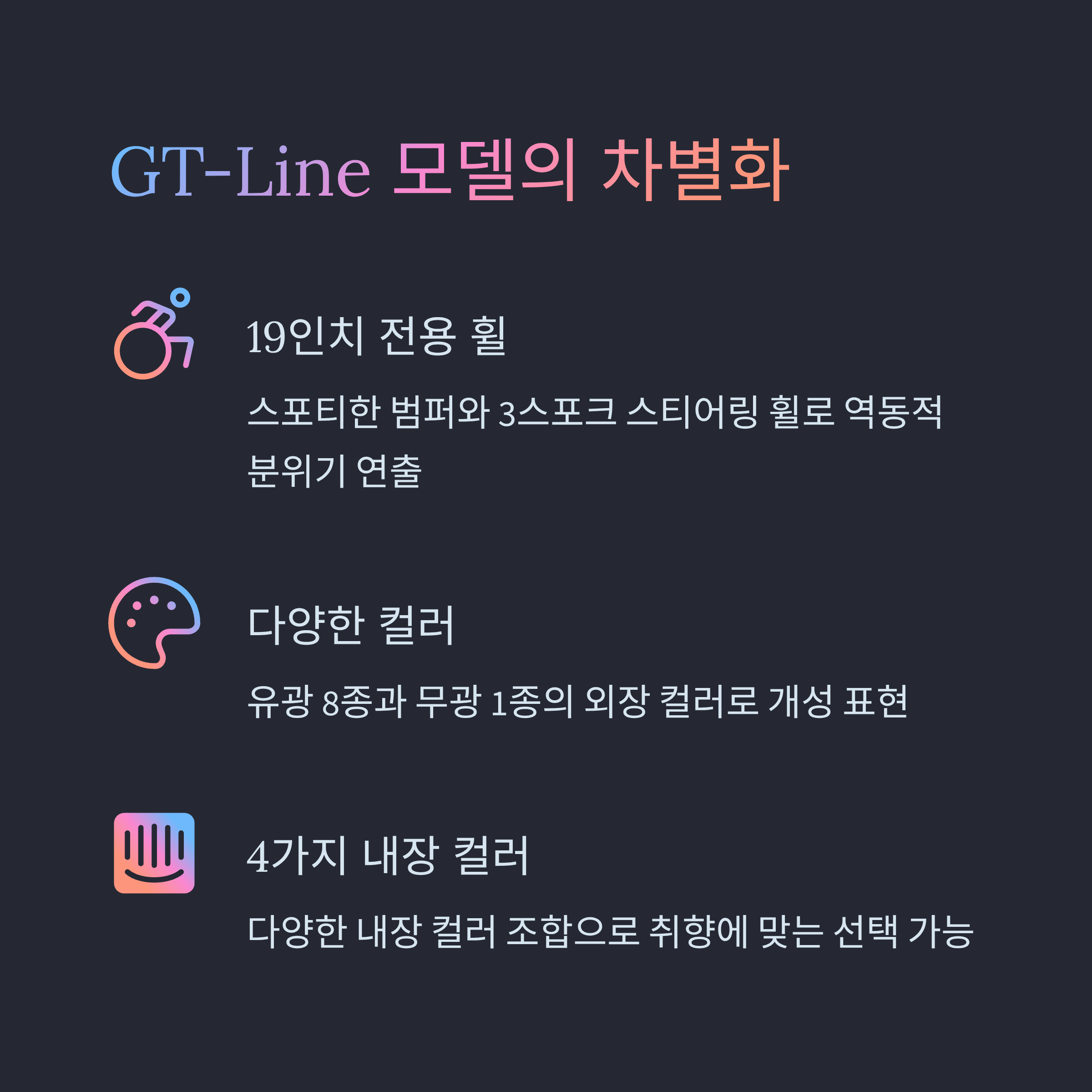 GT-Line 트림은 19인치 전용 휠, 스포티한 범퍼, 3스포크 스티어링 휠로 한층 역동적인 분위기를 보여줍니다. 유광 8종과 무광 1종의 외장 컬러, 4가지 내장 컬러 조합으로 개성을 표현할 수 있는 점도 매력적입니다.