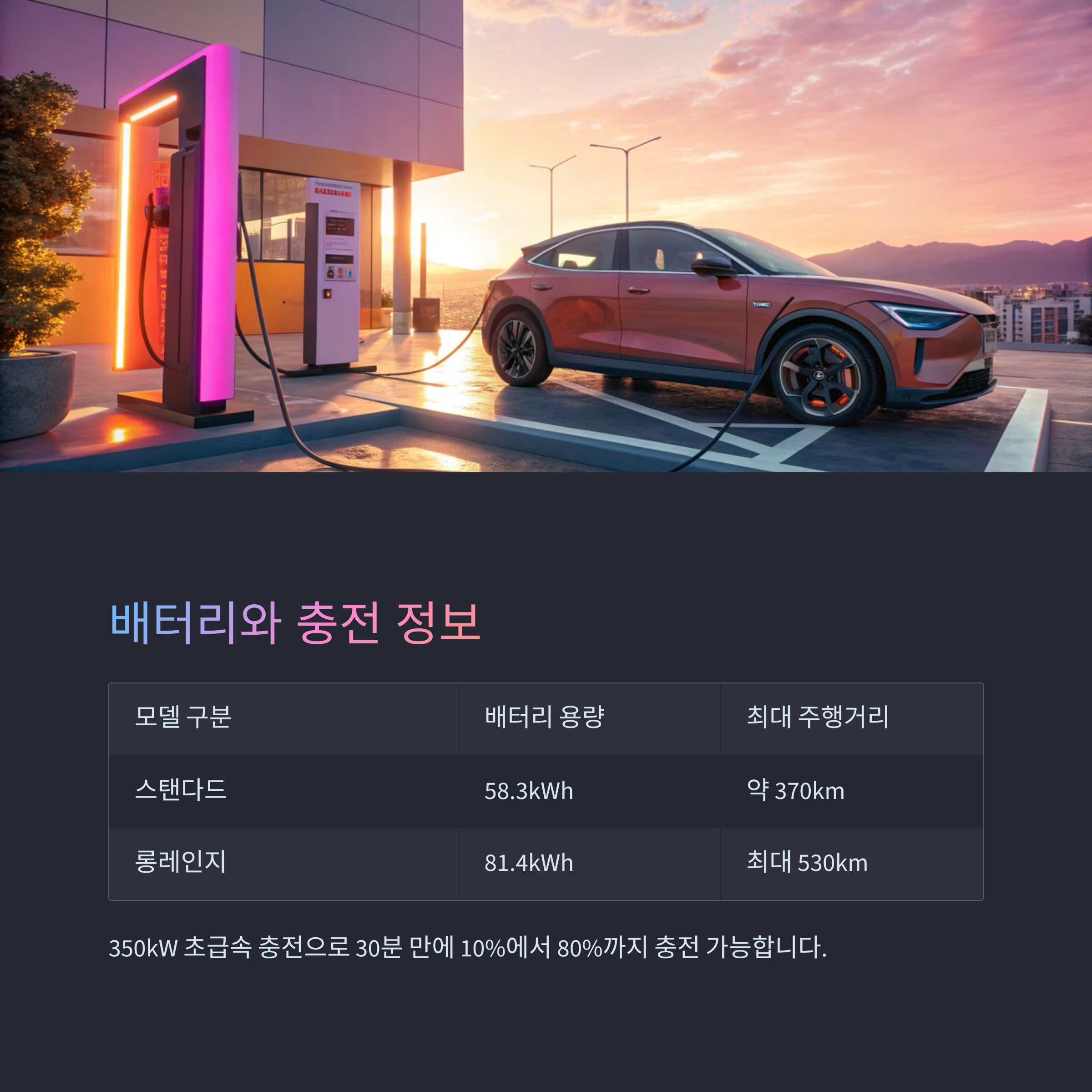 스탠다드 모델은 58.3kWh, 롱레인지 모델은 81.4kWh 배터리를 탑재합니다. 롱레인지 모델 기준으로 WLTP 최대 530km까지 주행할 수 있으며, 350kW 초급속 충전으로 30분 만에 10%에서 80%까지 충전 가능합니다.