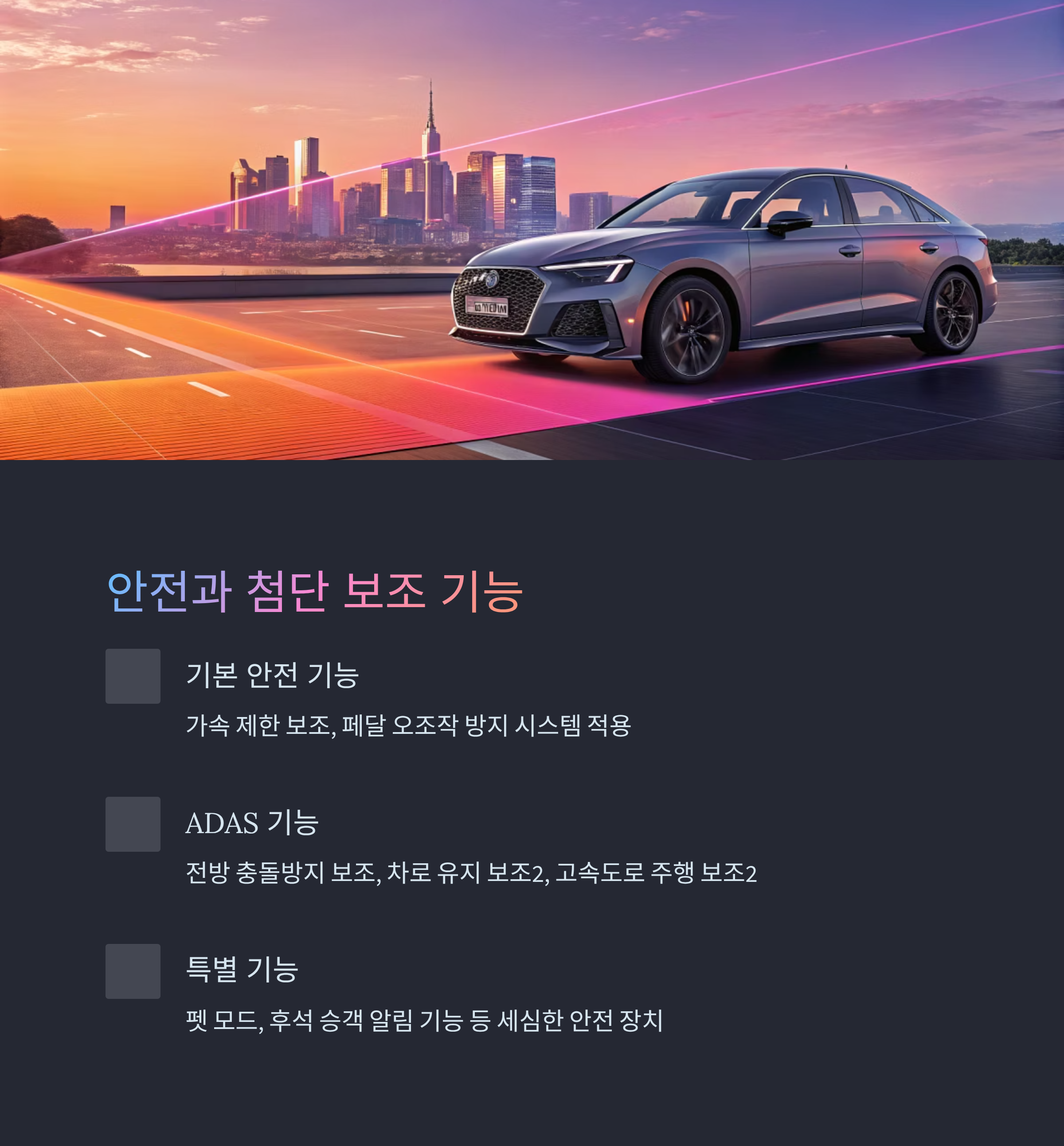 EV5에는 가속 제한 보조, 페달 오조작 방지 시스템이 적용되며, 전방 충돌방지 보조, 차로 유지 보조2, 고속도로 주행 보조2 등 다양한 ADAS 기능이 탑재되어 있습니다. 반려동물을 위한 펫 모드, 후석 승객 알림 기능 등 세심한 안전 장치도 눈길을 끕니다.