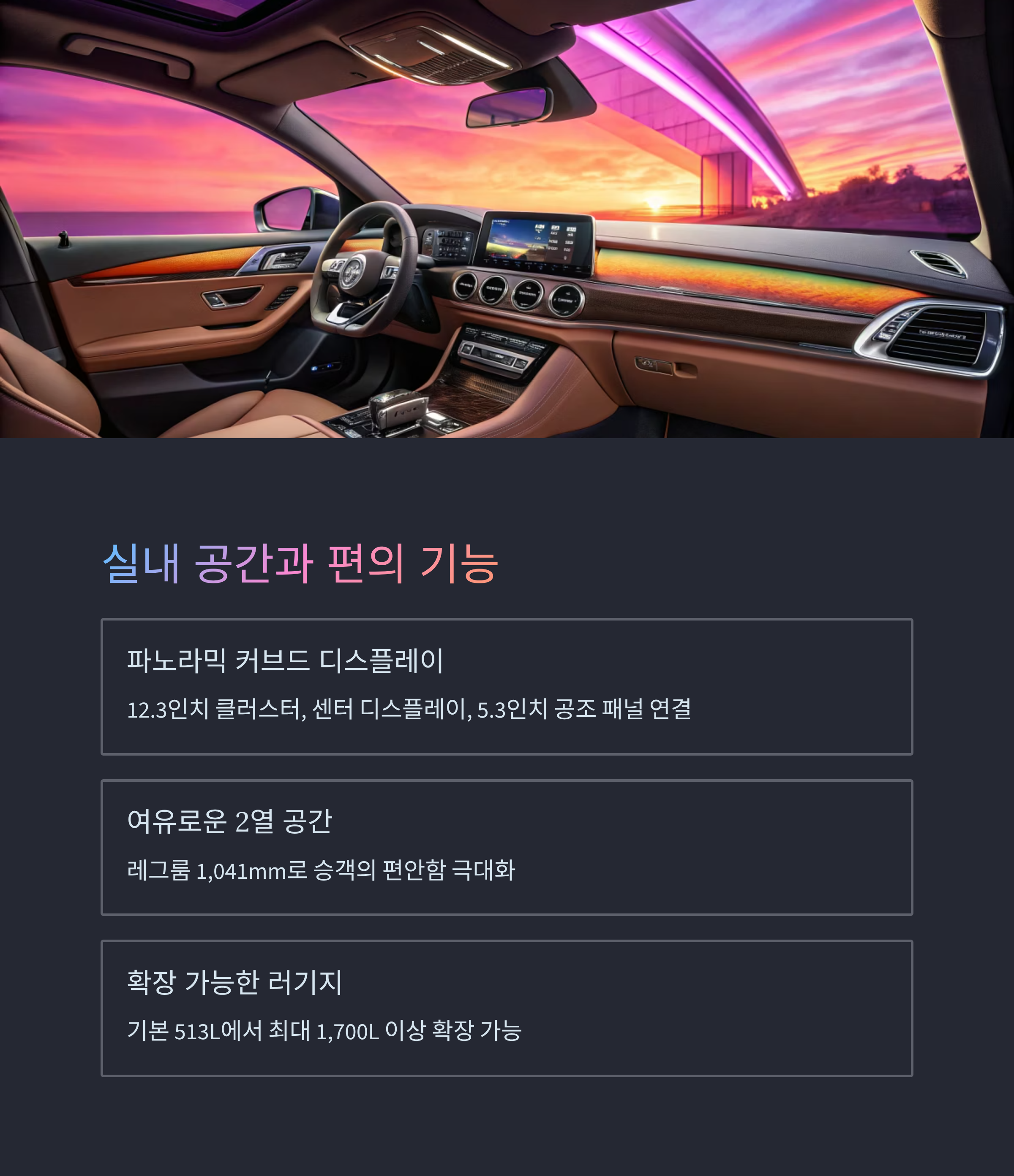 12.3인치 클러스터, 12.3인치 센터 디스플레이, 5.3인치 공조 패널이 연결된 파노라믹 커브드 디스플레이는 미래적인 실내 분위기를 만듭니다. 2열 레그룸은 1,041mm로 여유롭고, 기본 513L에서 최대 1,700L 이상 확장 가능한 러기지 공간은 패밀리 SUV로서의 장점을 극대화합니다.