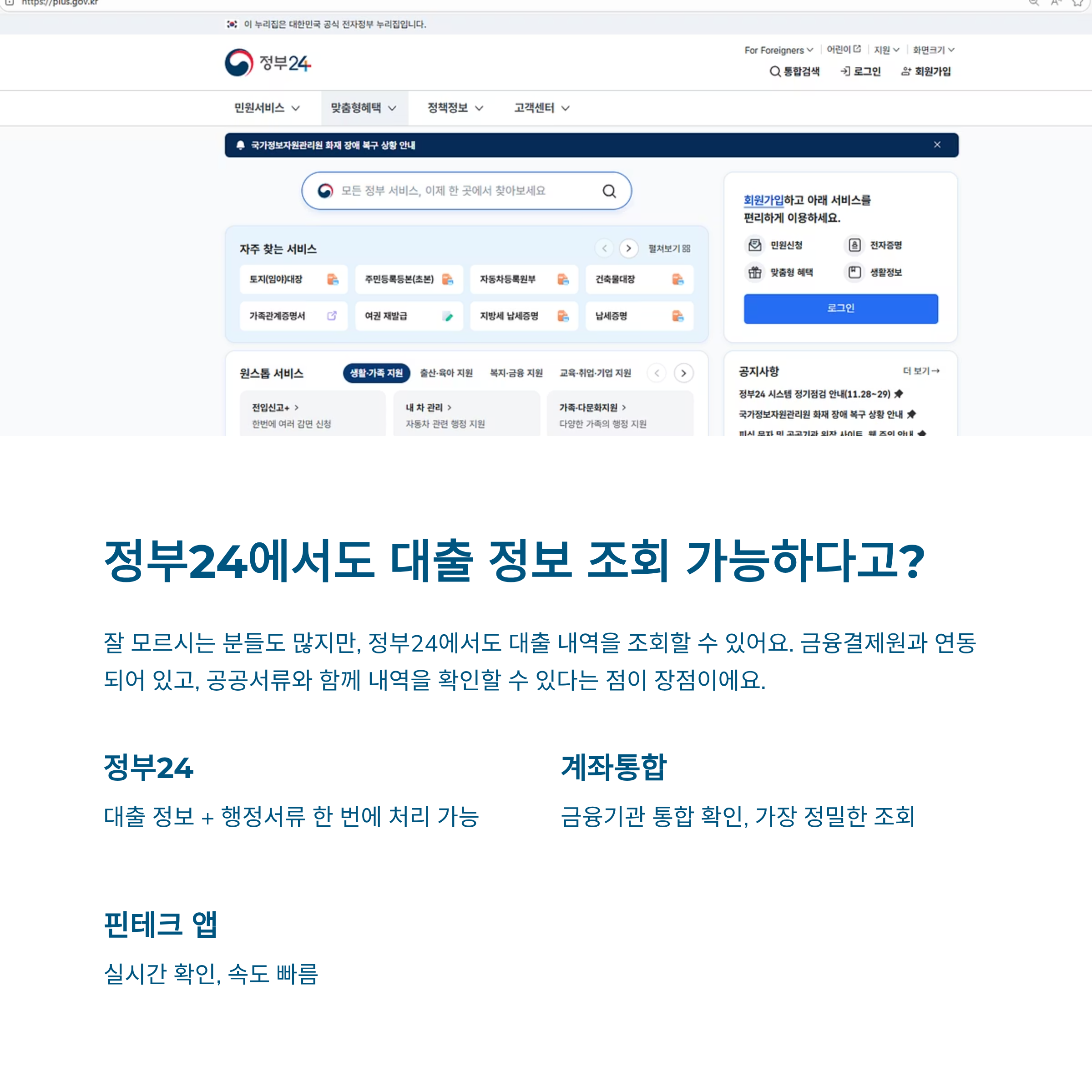 | 정부24 | 대출 정보 + 행정서류 | 한 번에 처리 가능 |