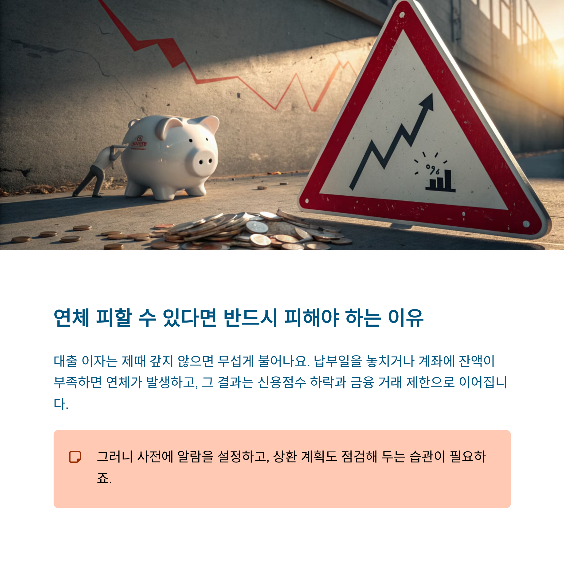 납부일을 놓치거나 계좌에 잔액이 부족하면 연체가 발생하고, 그 결과는 신용점수 하락과 금융 거래 제한으로 이어집니다.