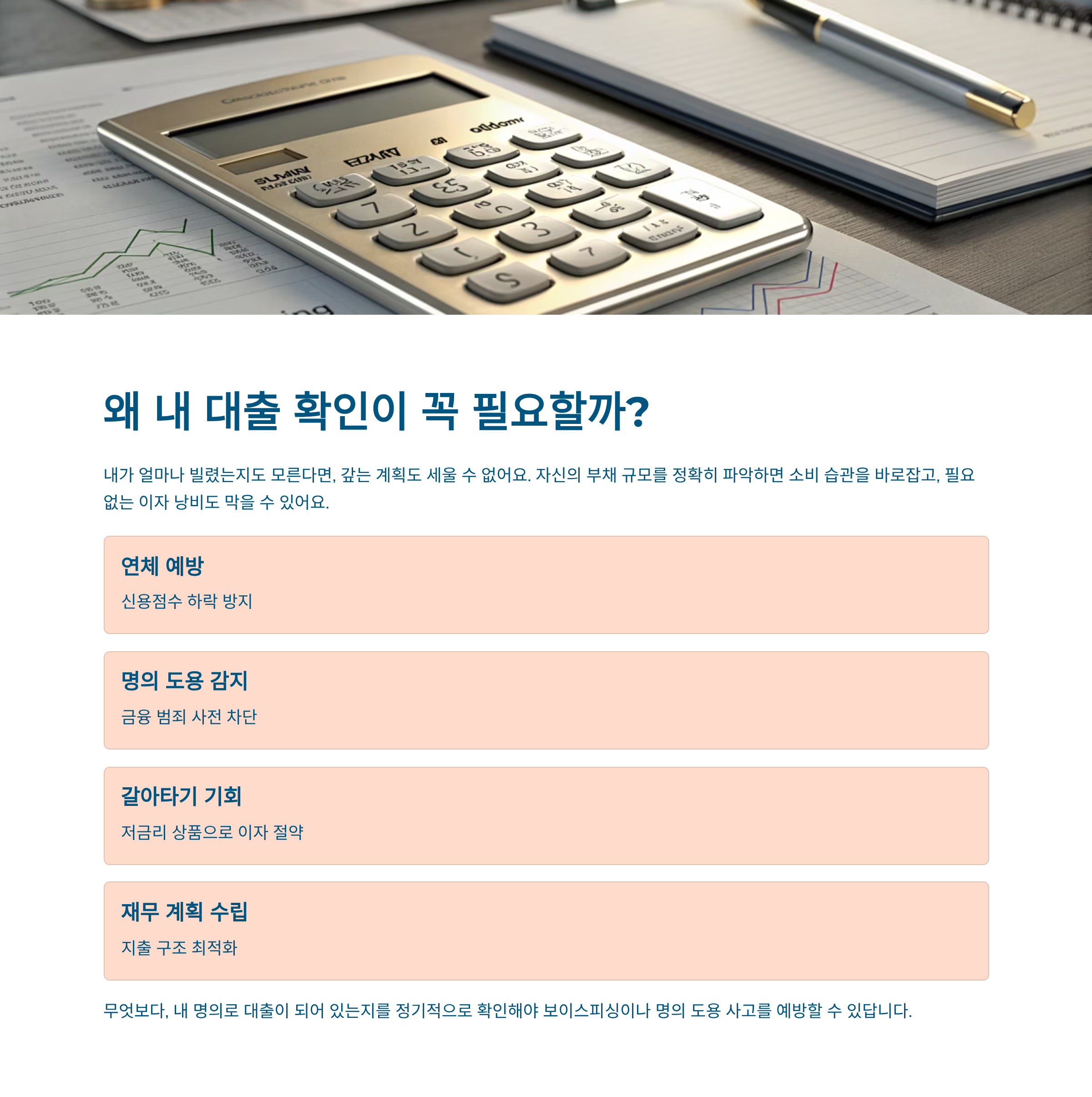 무엇보다, 내 명의로 대출이 되어 있는지를 정기적으로 확인해야 보이스피싱이나 명의 도용 사고를 예방할 수 있답니다.