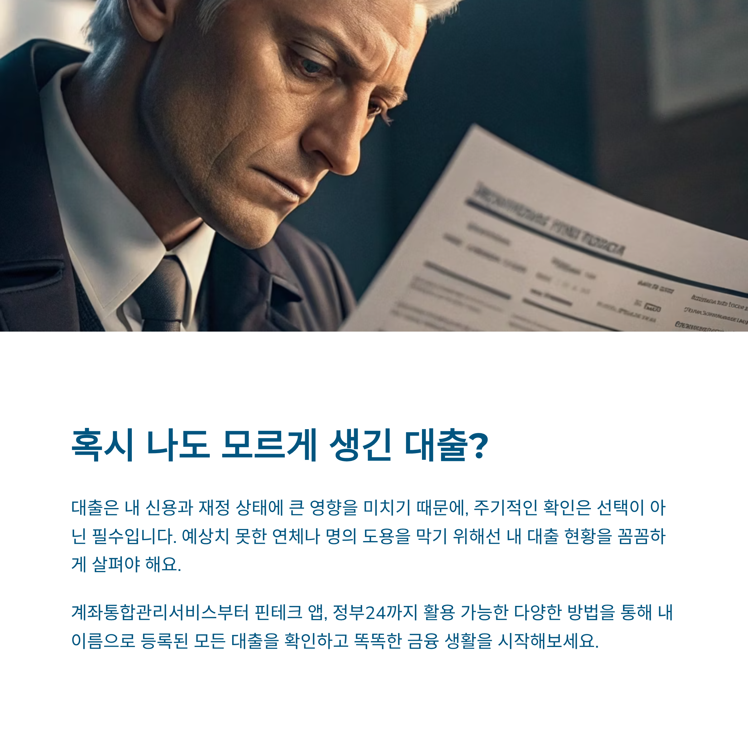 대출은 내 신용과 재정 상태에 큰 영향을 미치기 때문에, 주기적인 확인은 선택이 아닌 필수입니다. 예상치 못한 연체나 명의 도용을 막기 위해선 내 대출 현황을 꼼꼼하게 살펴야 해요. 계좌통합관리서비스부터 핀테크 앱, 정부24까지 활용 가능한 다양한 방법을 통해 내 이름으로 등록된 모든 대출을 확인하고 똑똑한 금융 생활을 시작해보세요.