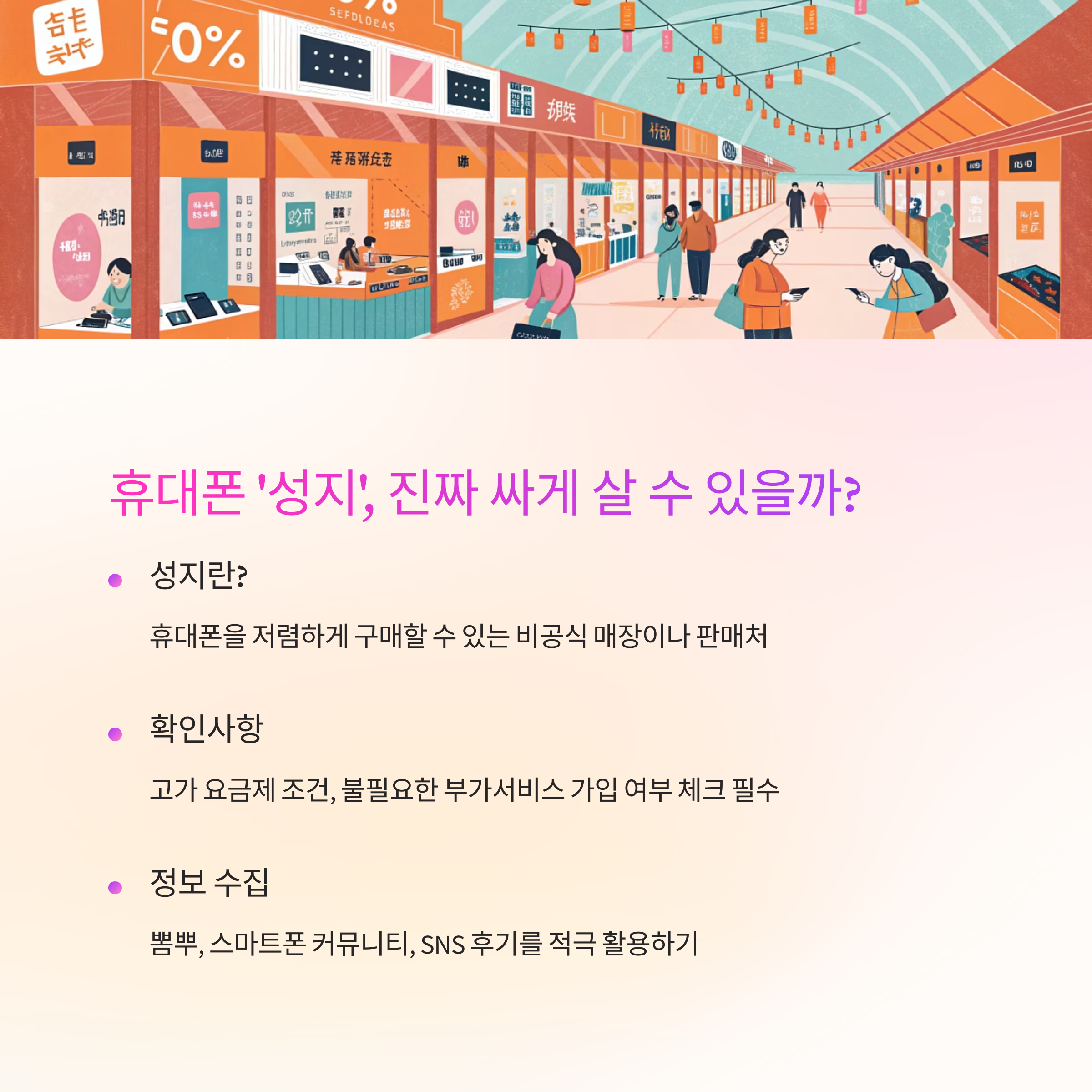 ‘성지’는 휴대폰을 저렴하게 구매할 수 있는 비공식 매장이나 판매처를 뜻합니다.