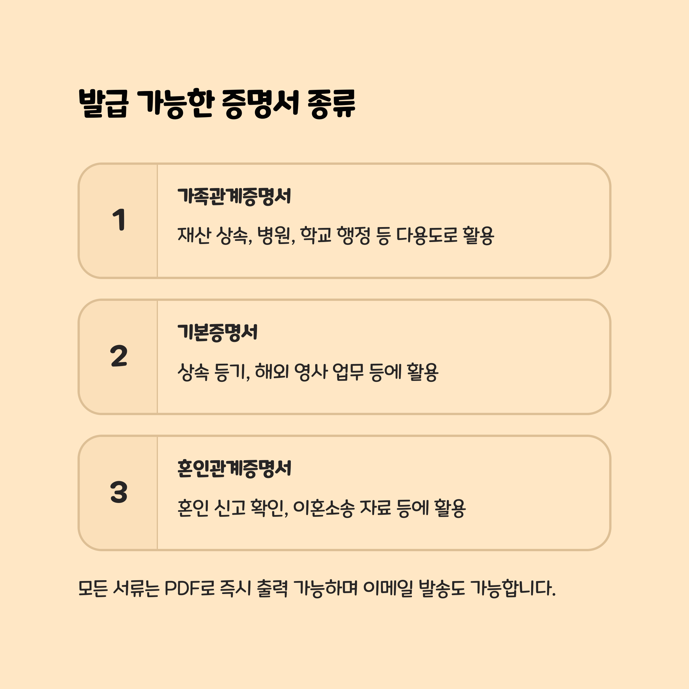 | 기본증명서 | 상속 등기, 해외 영사 업무 등 활용 |