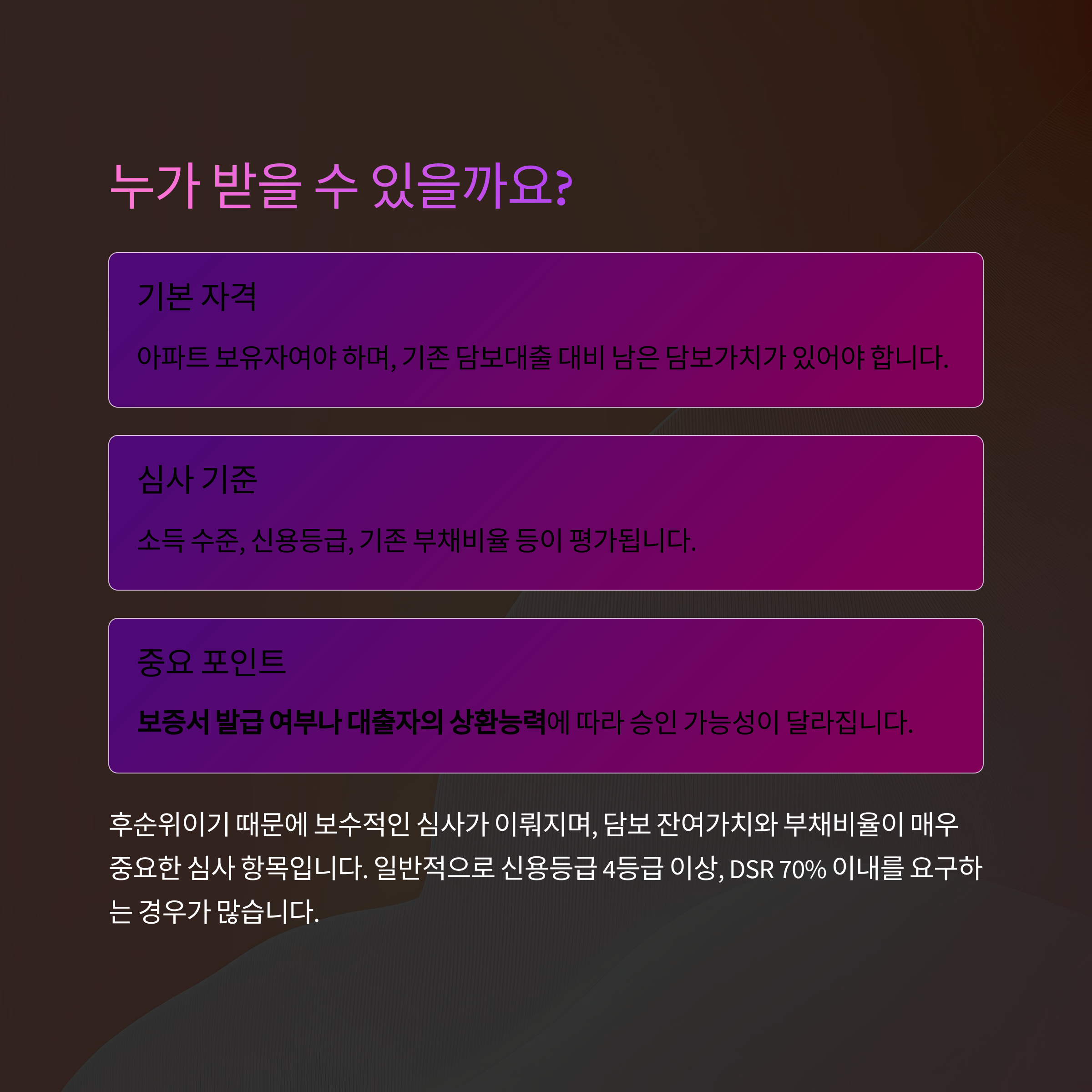 기본적으로 아파트 보유자여야 하며, 기존 담보대출 대비 남은 담보가치가 있어야 합니다.