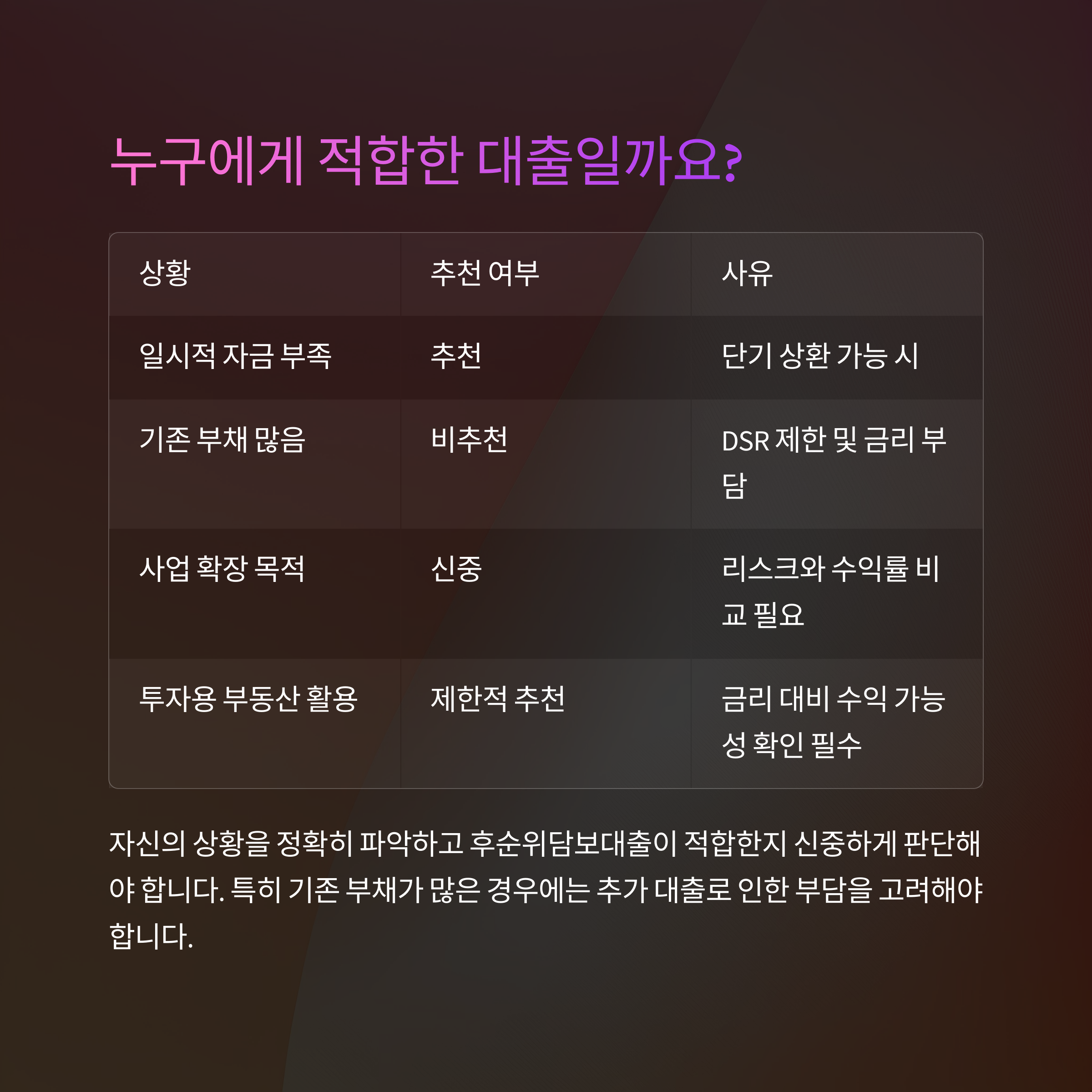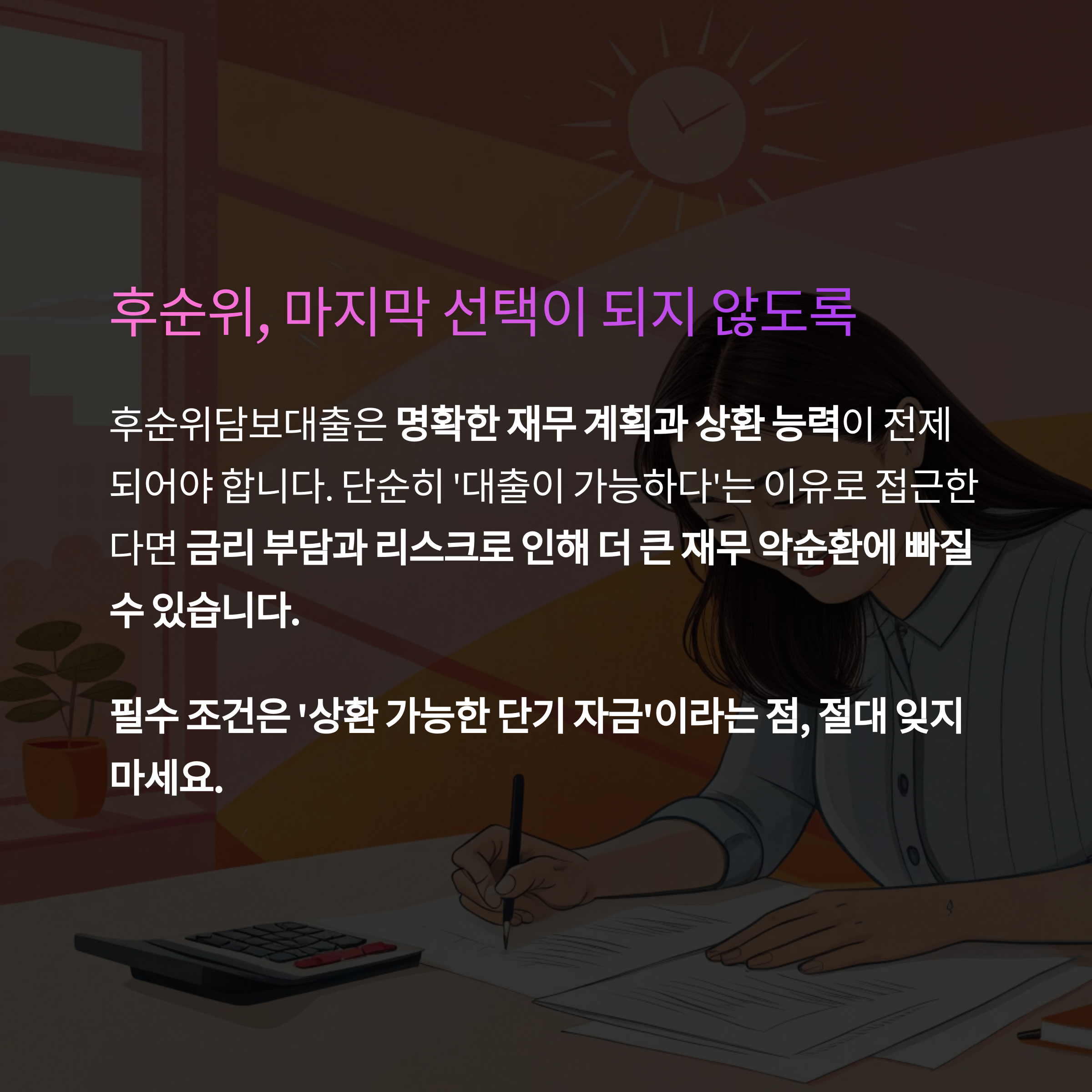 후순위담보대출은 명확한 재무 계획과 상환 능력이 전제되어야 합니다.