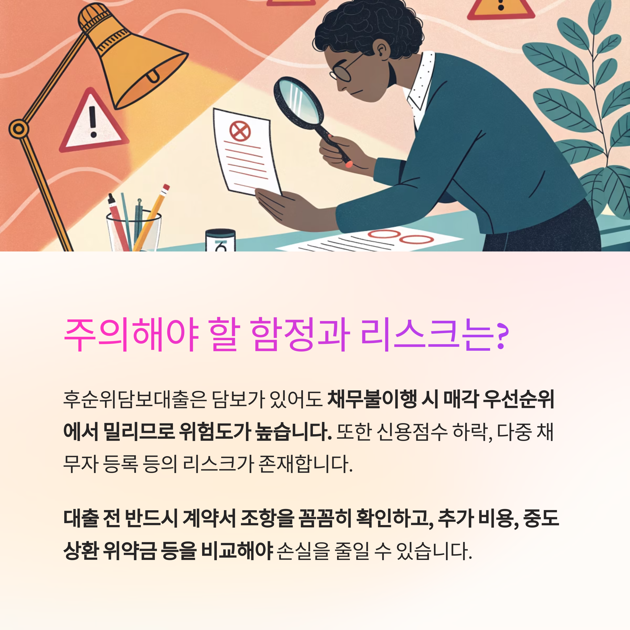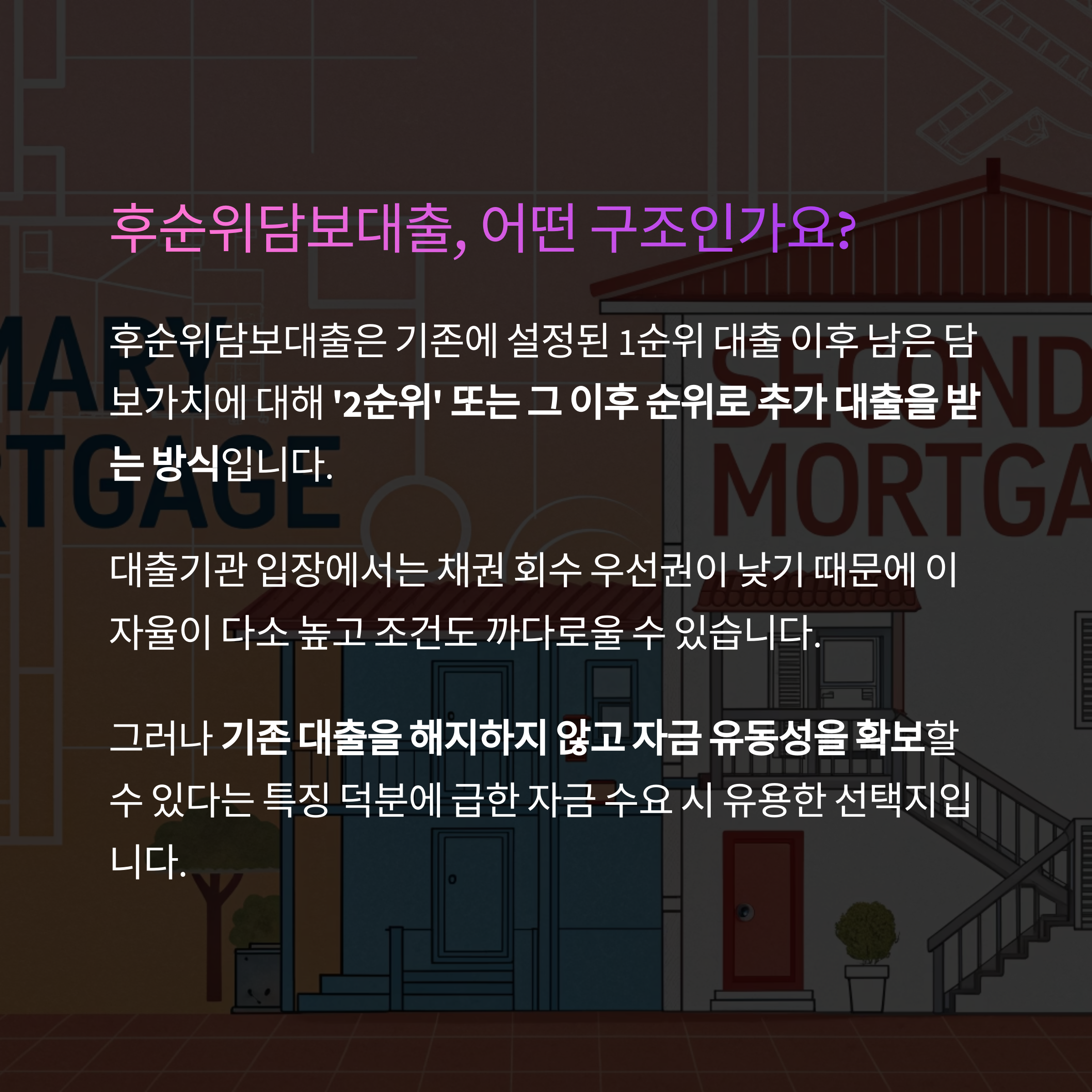 이 글에서는 후순위담보대출의 구조, 자격, 장단점, 유의사항 등을 상세하게 안내드립니다.