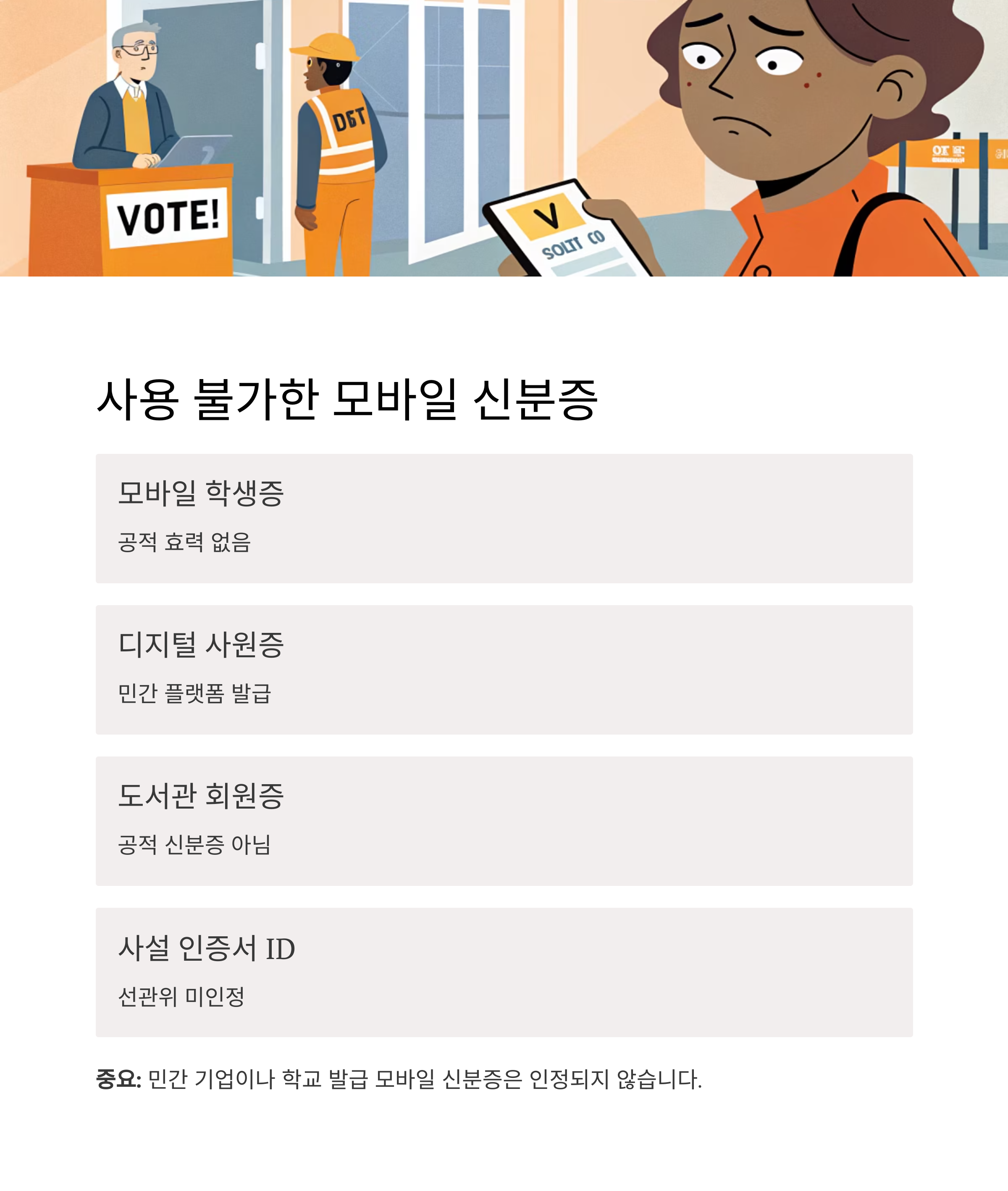 다음과 같은 모바일 신분증은 투표소에서 인정되지 않으며,