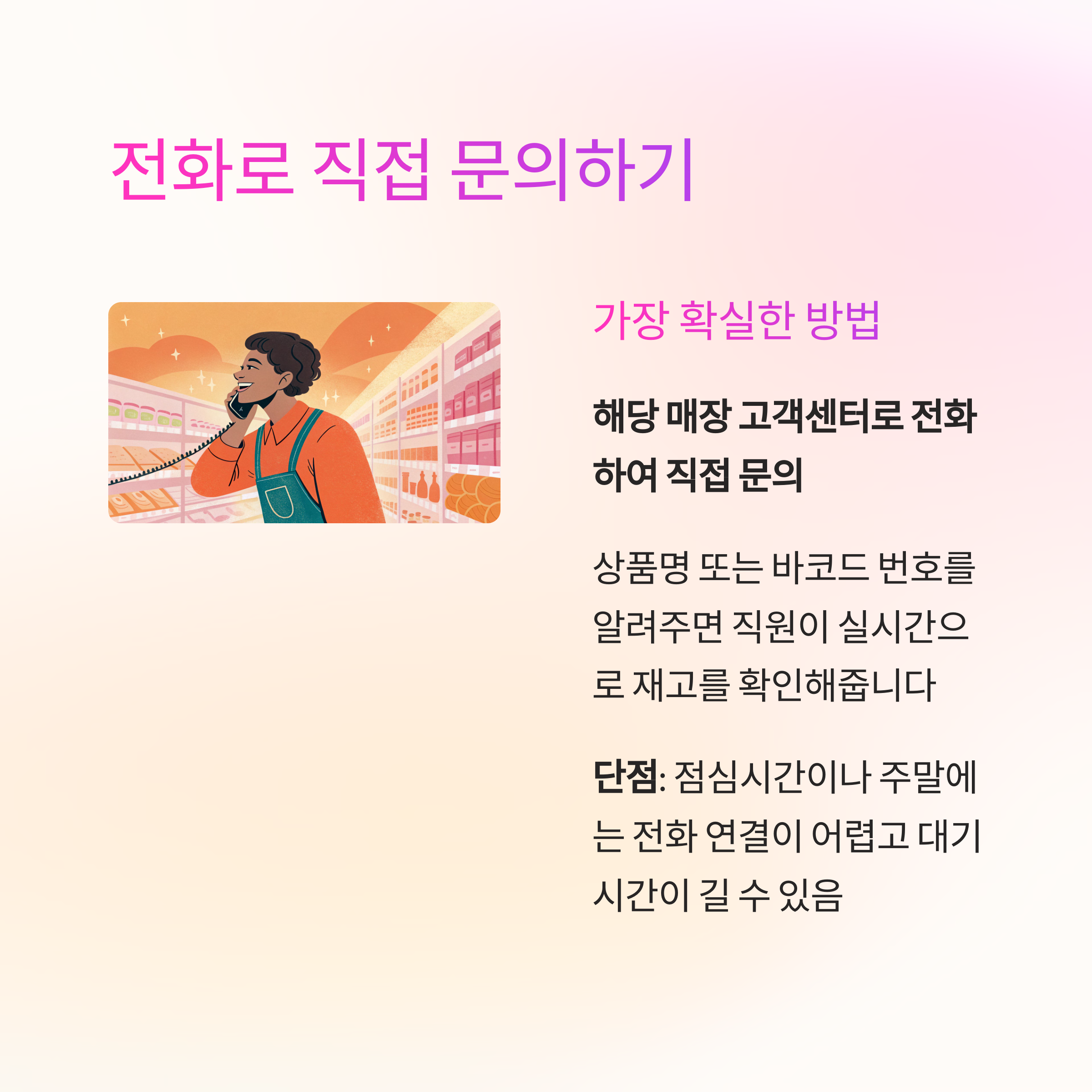 상품명 또는 바코드 번호를 알려주면 직원이 실시간으로 재고를 확인해줍니다
