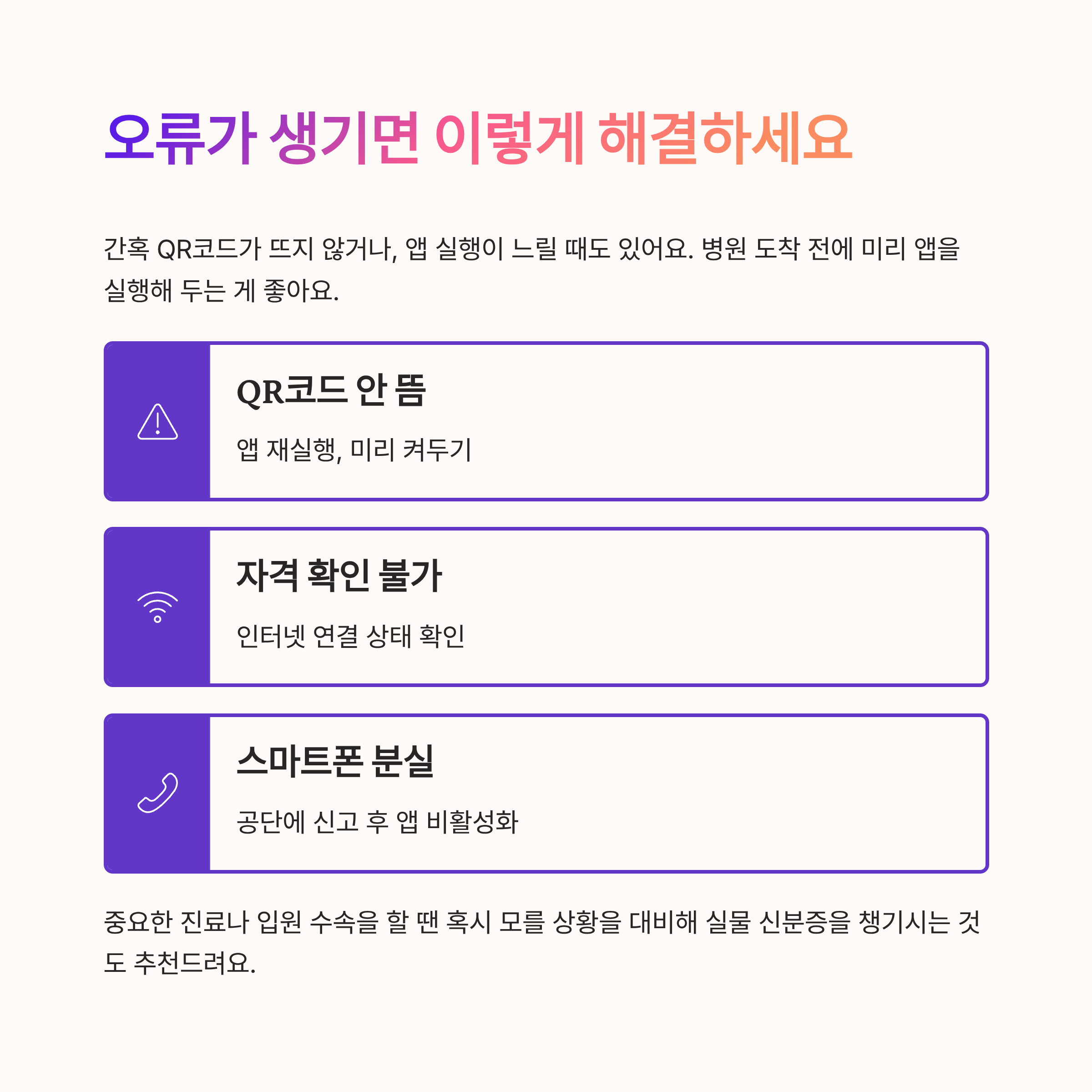 간혹 QR코드가 뜨지 않거나, 앱 실행이 느릴 때도 있어요. 이런 경우엔 병원 도착 전에 미리 앱을 실행해 두는 게 좋아요.