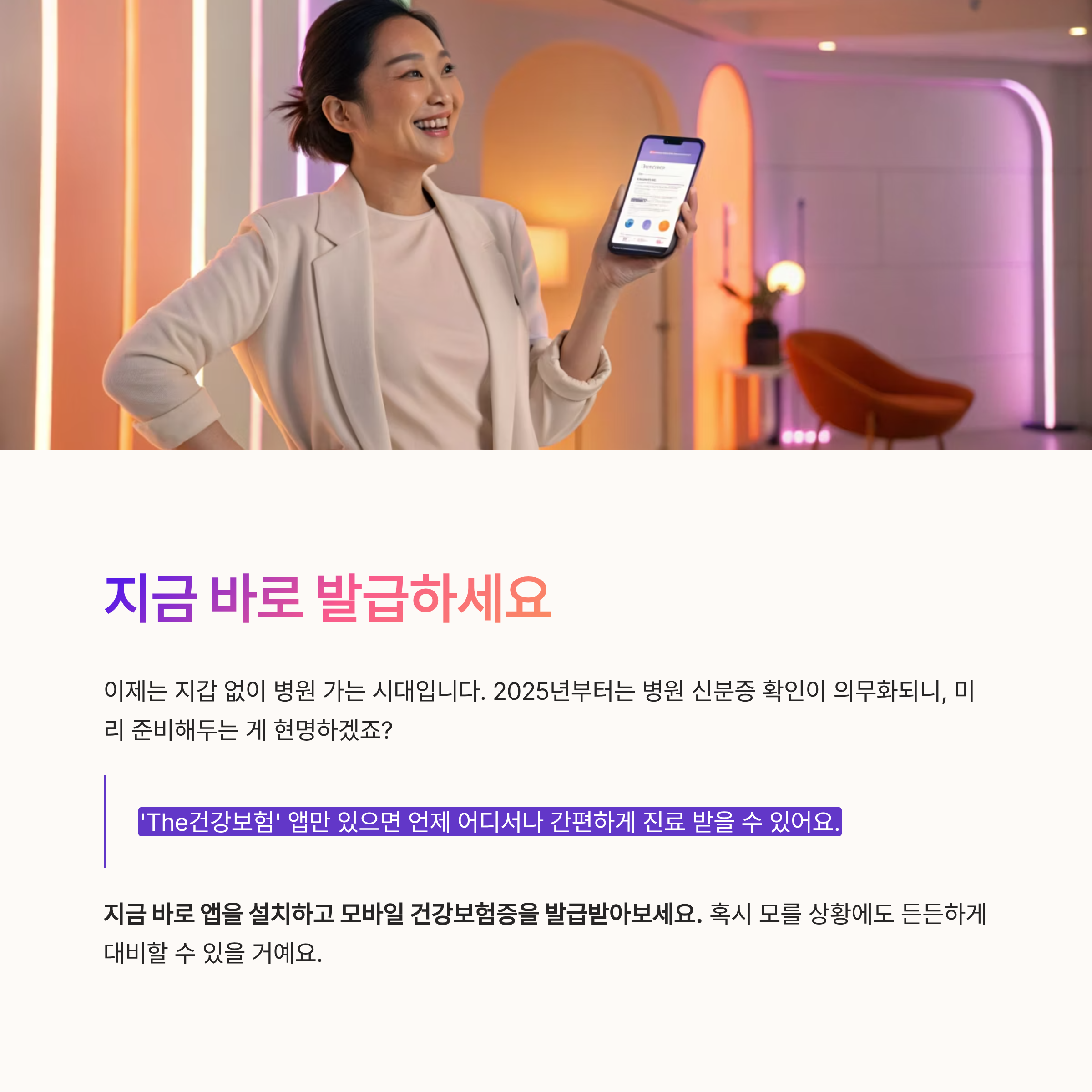 디지털 시대, 이제는 지갑보다 스마트폰이 먼저입니다. 건강보험증도 예외가 아니죠. ‘The건강보험’ 앱 하나면 병원, 약국에서 실물 건강보험증 없이도 본인 확인이 가능합니다. 2025년부터는 사용 범위도 더 넓어질 예정이라, 지금 미리 발급받아 두면 더 편리하게 활용하실 수 있어요.