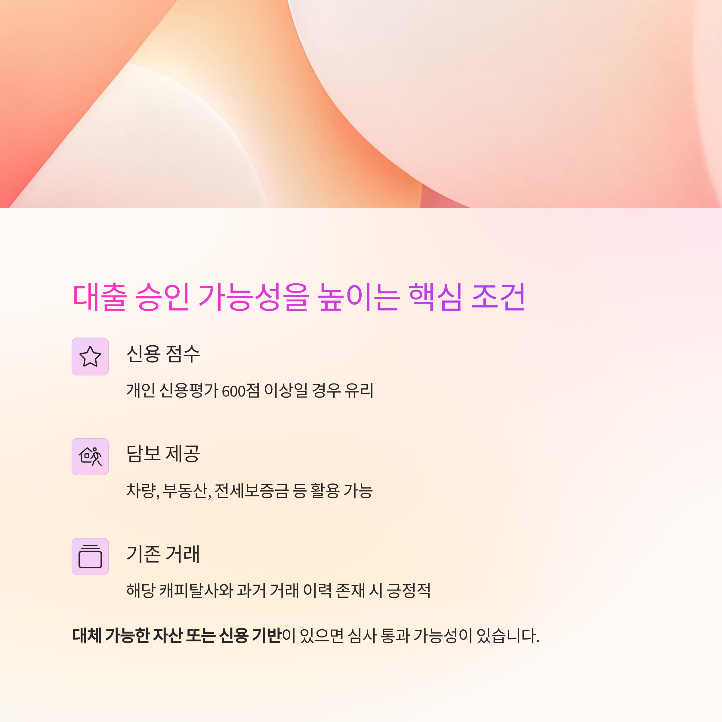 | 기존 거래 | 해당 캐피탈사와 과거 거래 이력 존재 시 긍정적 |