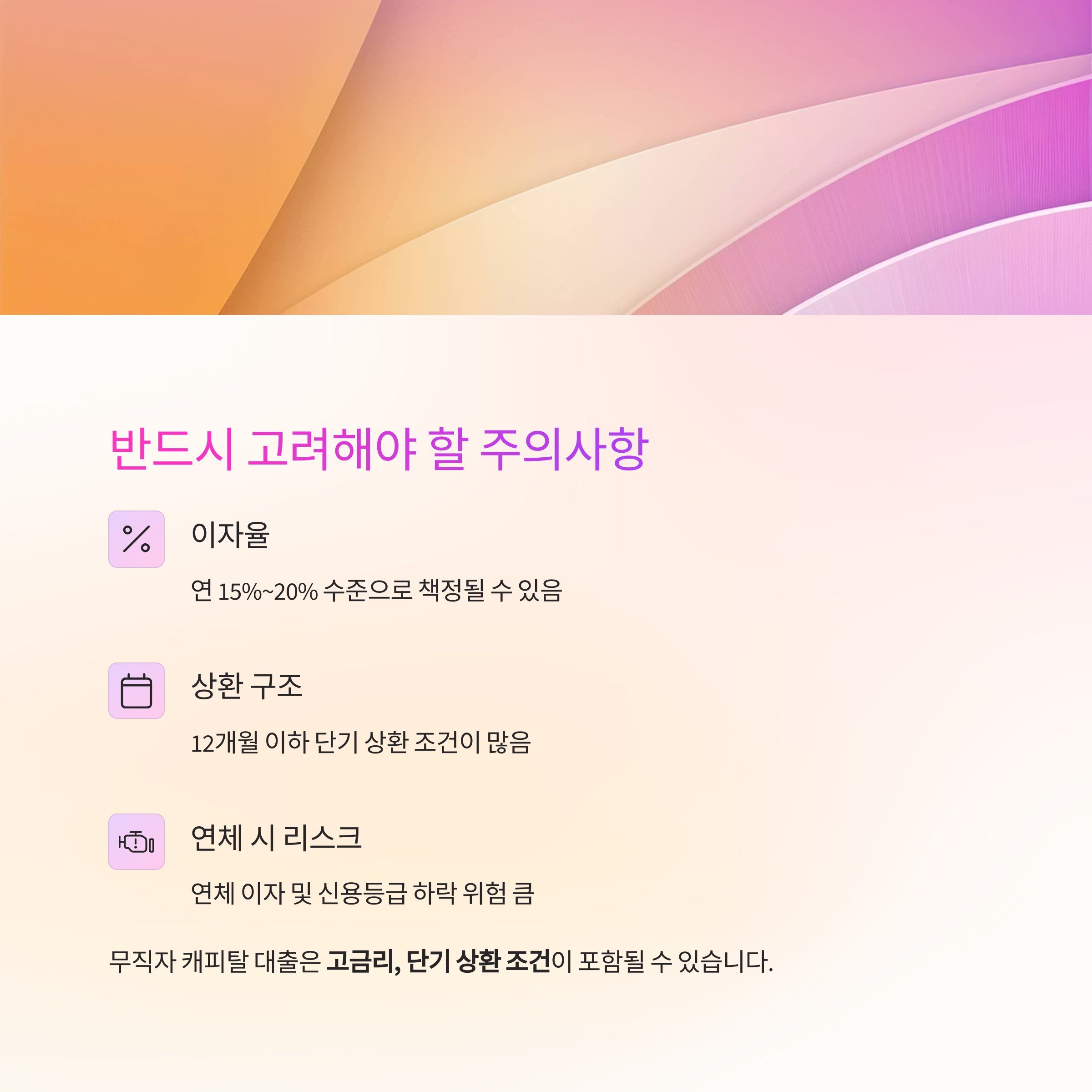 무직자 캐피탈 대출은 상대적으로 고금리, 단기 상환 조건이 포함될 수 있습니다