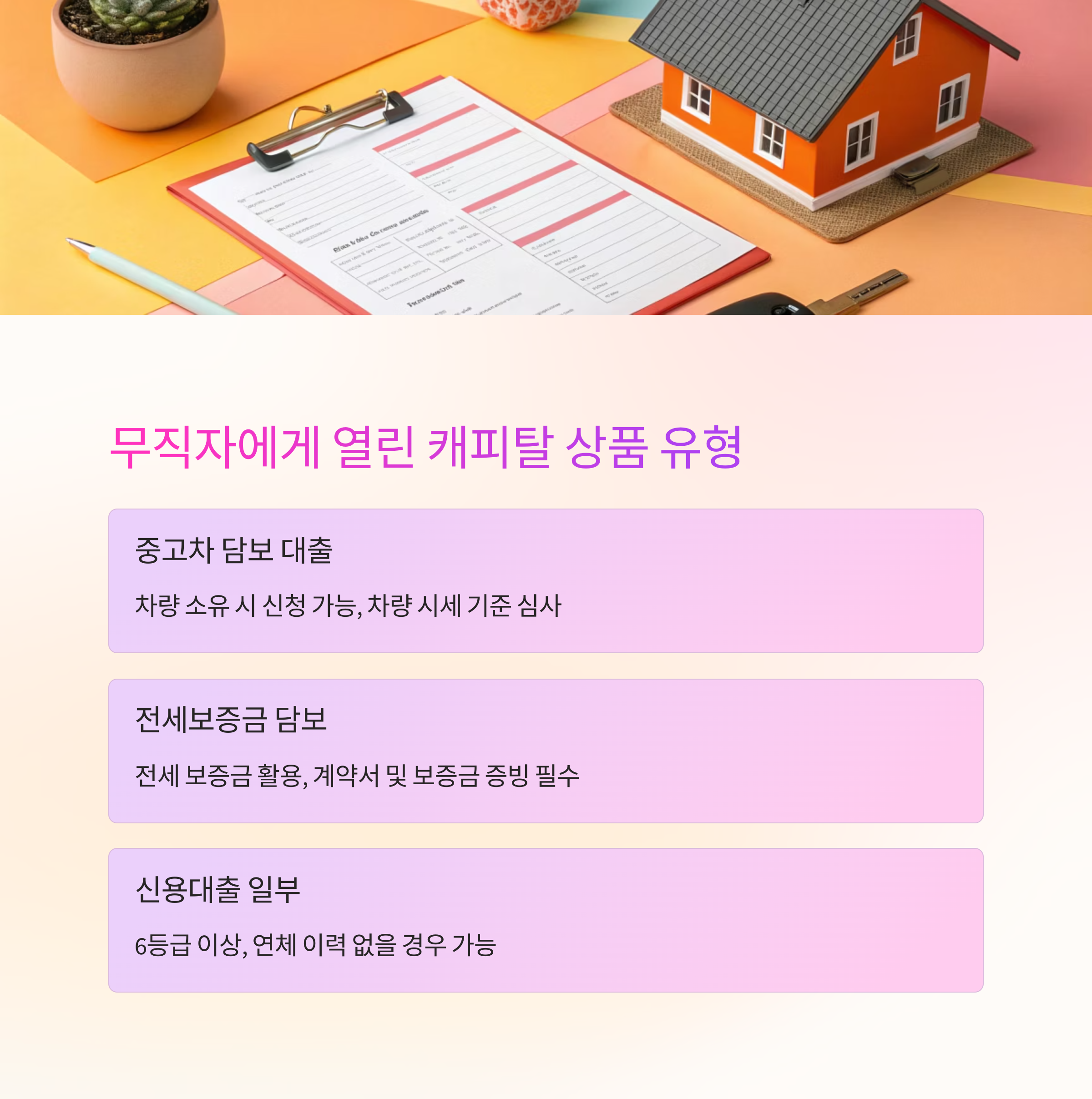 다양한 캐피탈 상품 중 무직자에게 열려 있는 유형은 다음과 같습니다