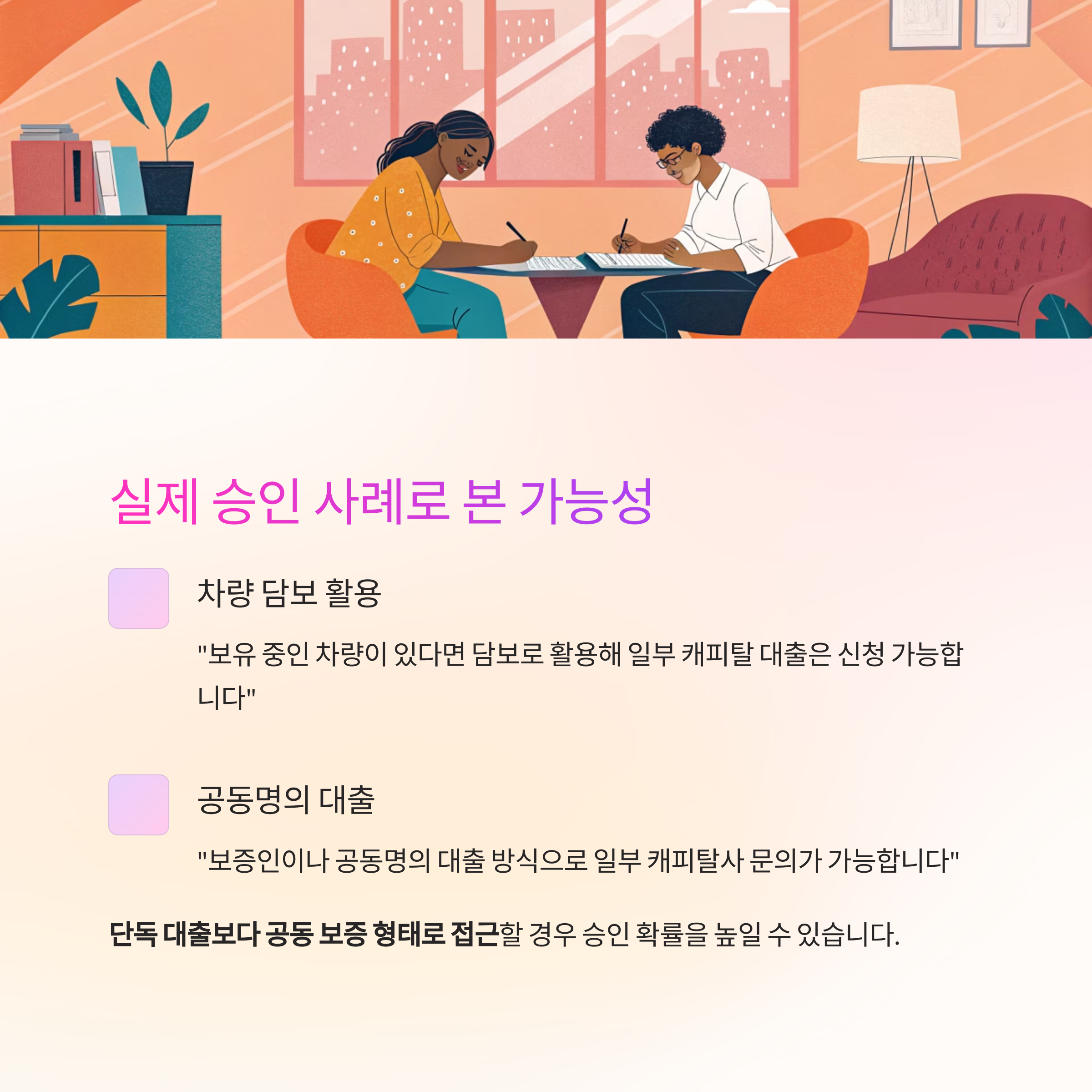 다만 보증인이나 공동명의 대출 방식으로 일부 캐피탈사 문의가 가능합니다"