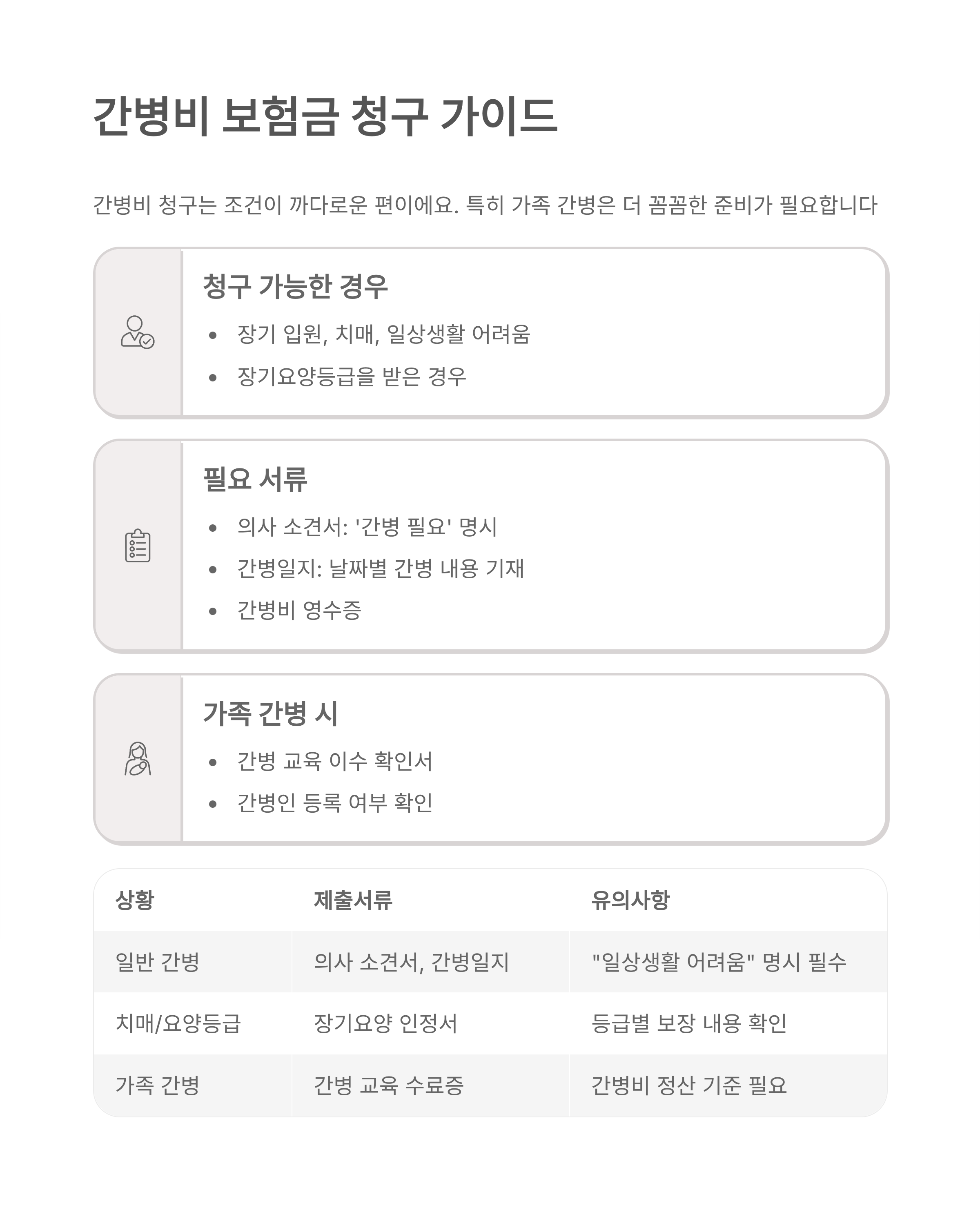 | 일반 간병 | 의사 소견서, 간병일지 | "일상생활 어려움" 명시 필수 |