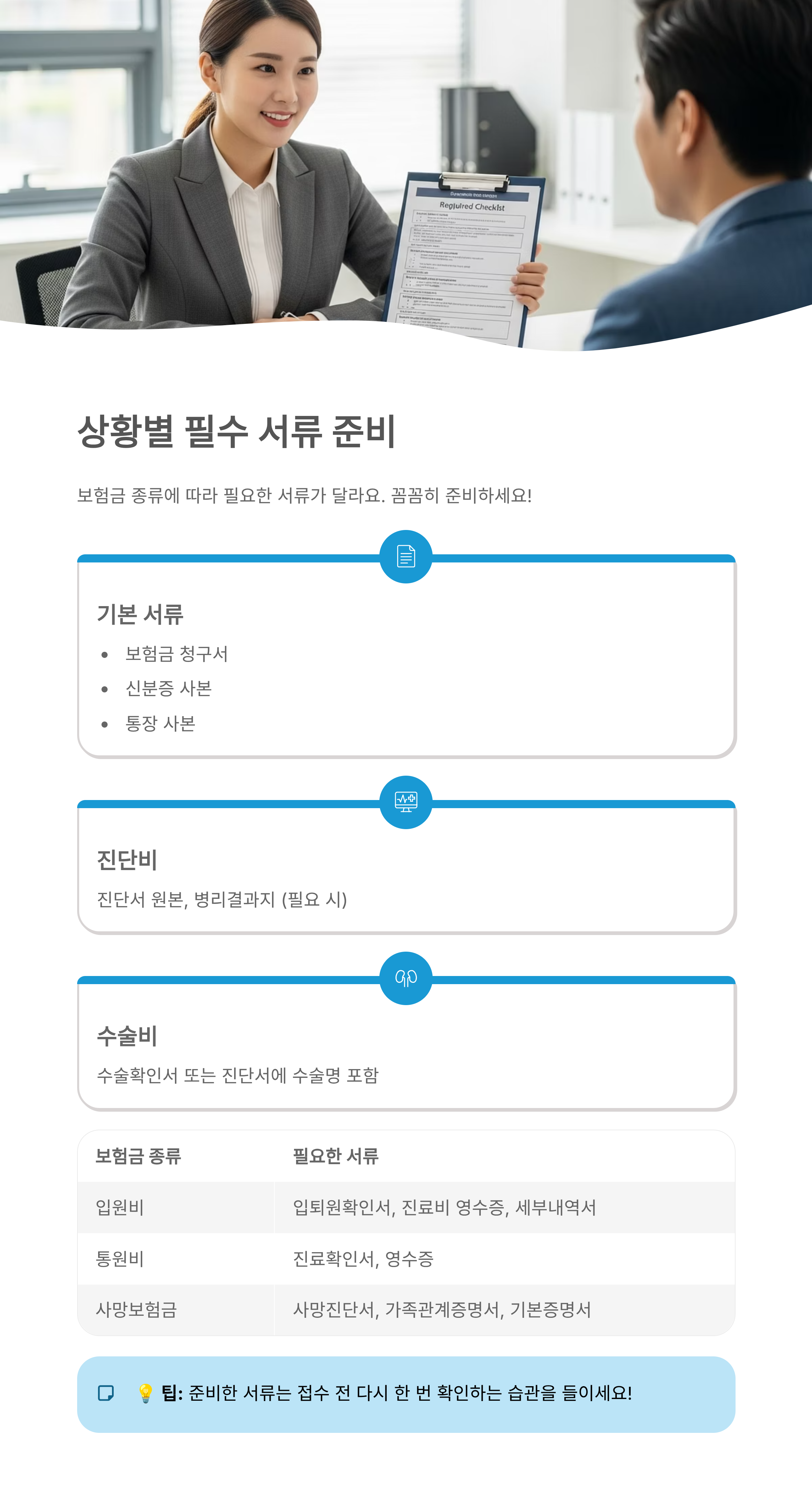 보험금 종류에 따라 필요한 서류가 다르기 때문에 꼼꼼히 준비해야 합니다.